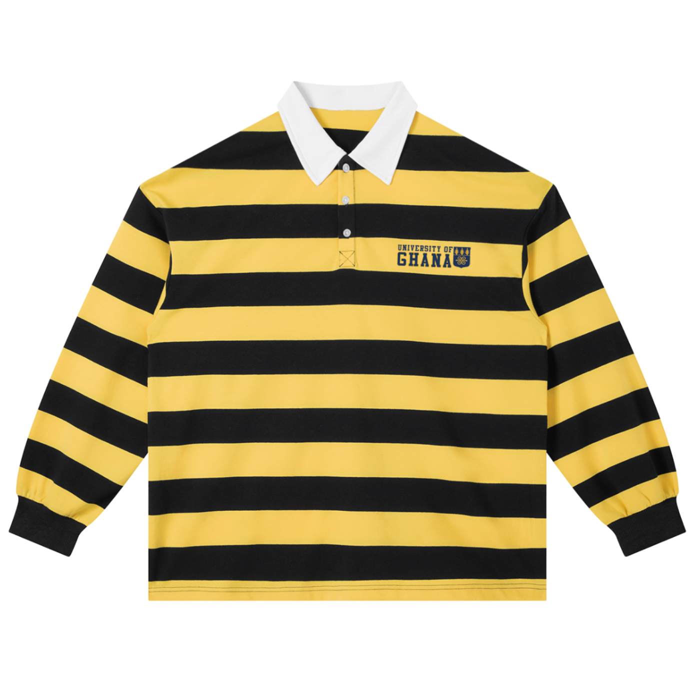 Rep UoG in style with this bold striped rugby polo. The yellow and navy color-block stripes proudly reflect the University of Ghana's official school colors, making this piece an instant nod to Legon pride. Featuring the University of Ghana crest on the chest, this long-sleeve polo pairs classic varsity energy with a relaxed, modern fit, while the crisp white collar keeps it sharp. Made from a cotton-spandex blend for comfortable stretch and a soft hand feel, it's an easy layer for campus, game day, or everyday wear.