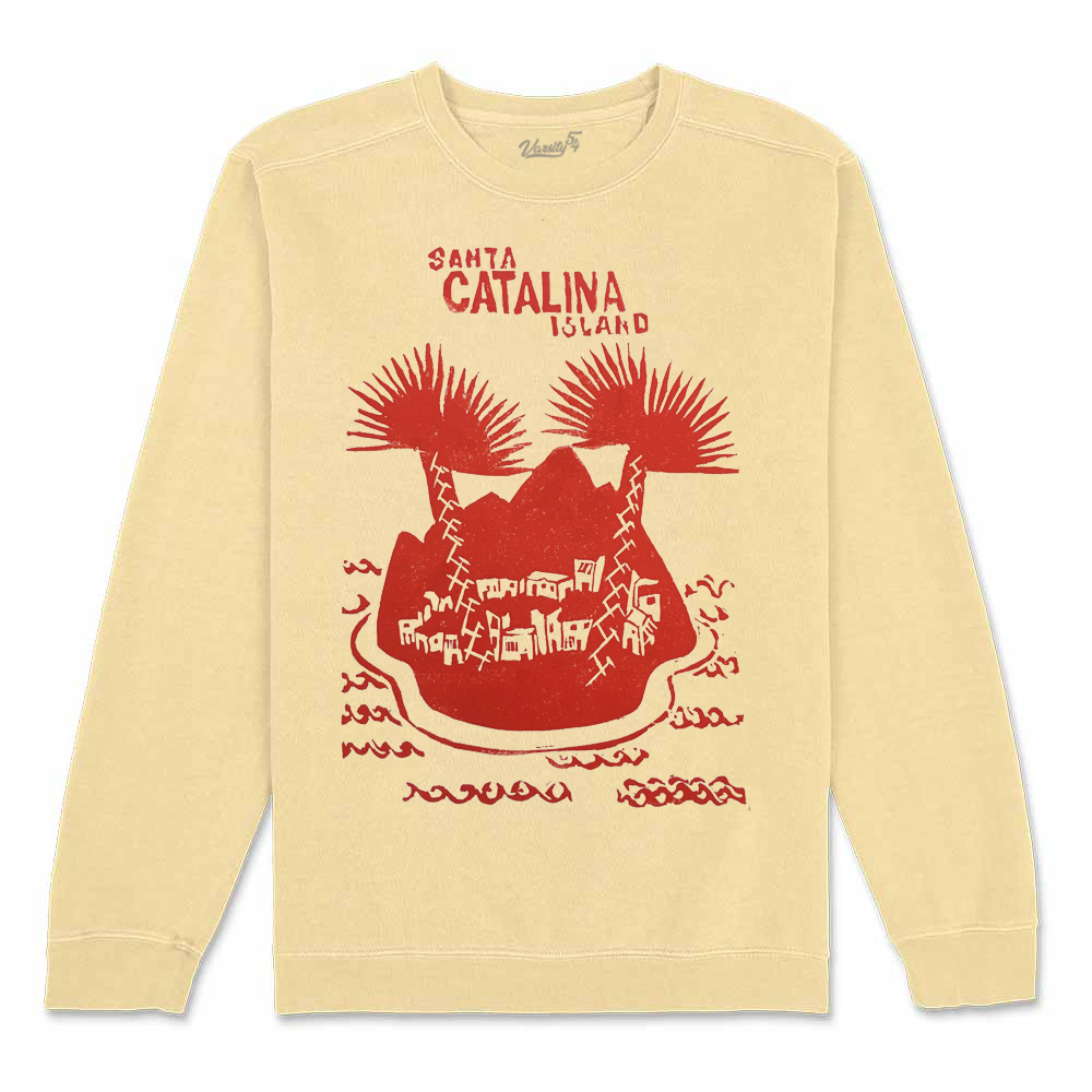 Celebrate the iconic California island getaway with this vintage-inspired Santa Catalina Island sweatshirt. The artistic design features a stylized red silhouette of the island's mountainous terrain with charming coastal architecture nestled within, surrounded by ocean waves and topped with distinctive palm fronds that capture the island's tropical paradise vibe.