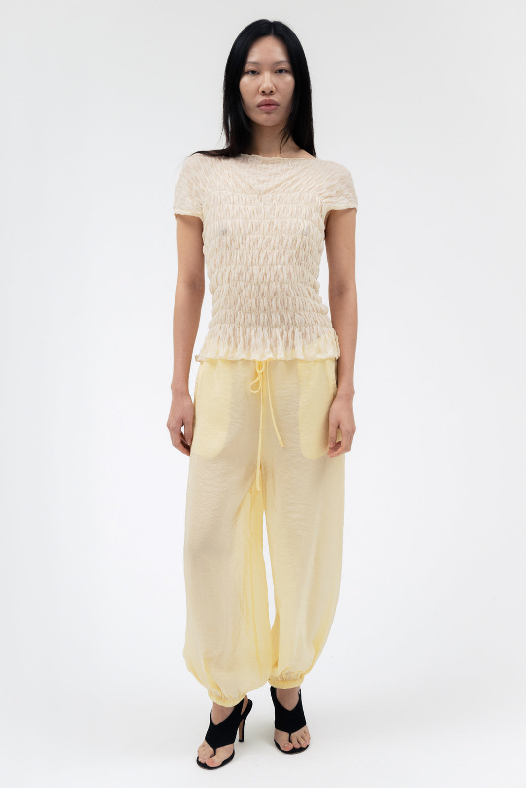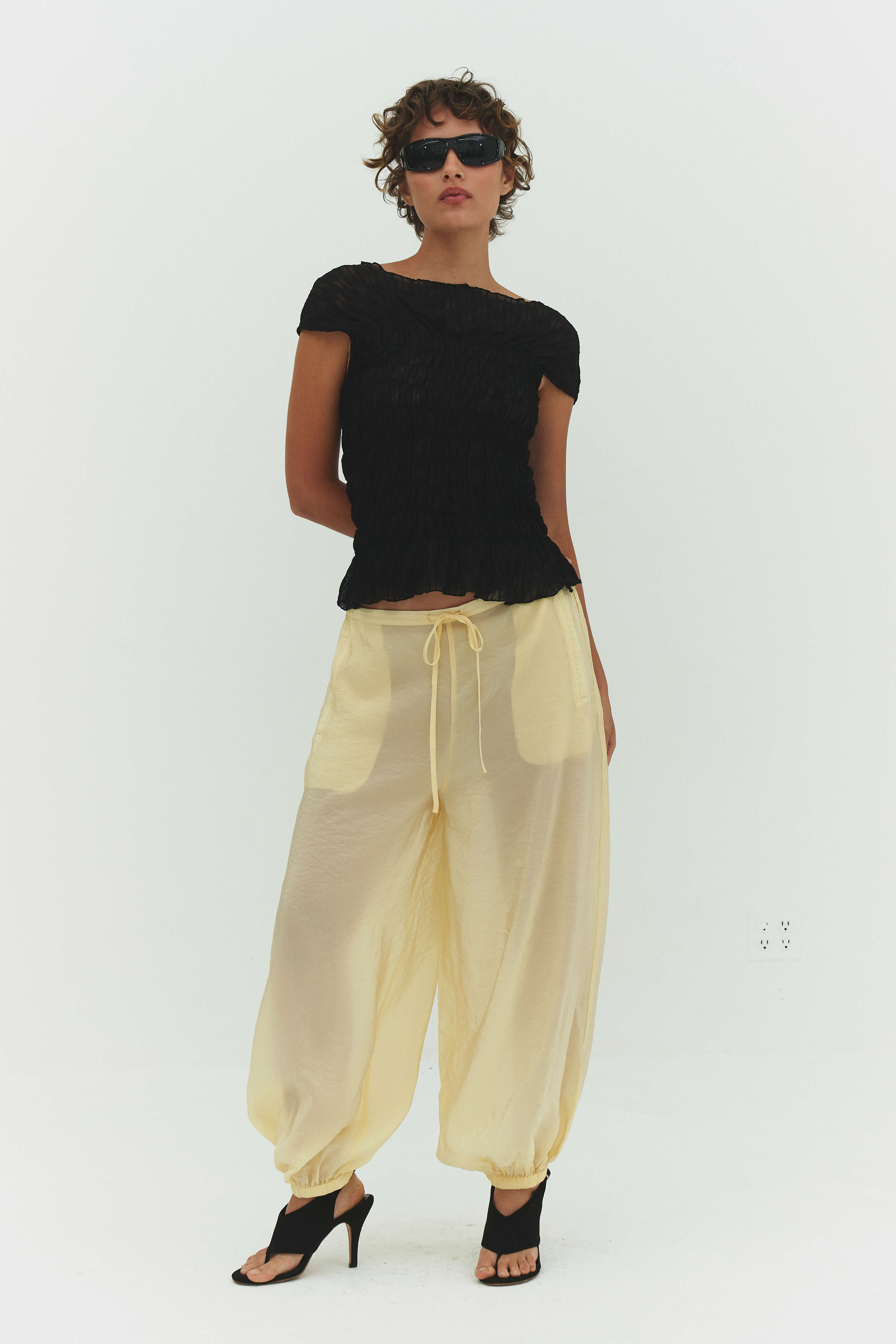The Zora Voile Pant is a lightweight balloon pant with elastic cuffs and a drawstring waist. Perfect for warm weather or layering.