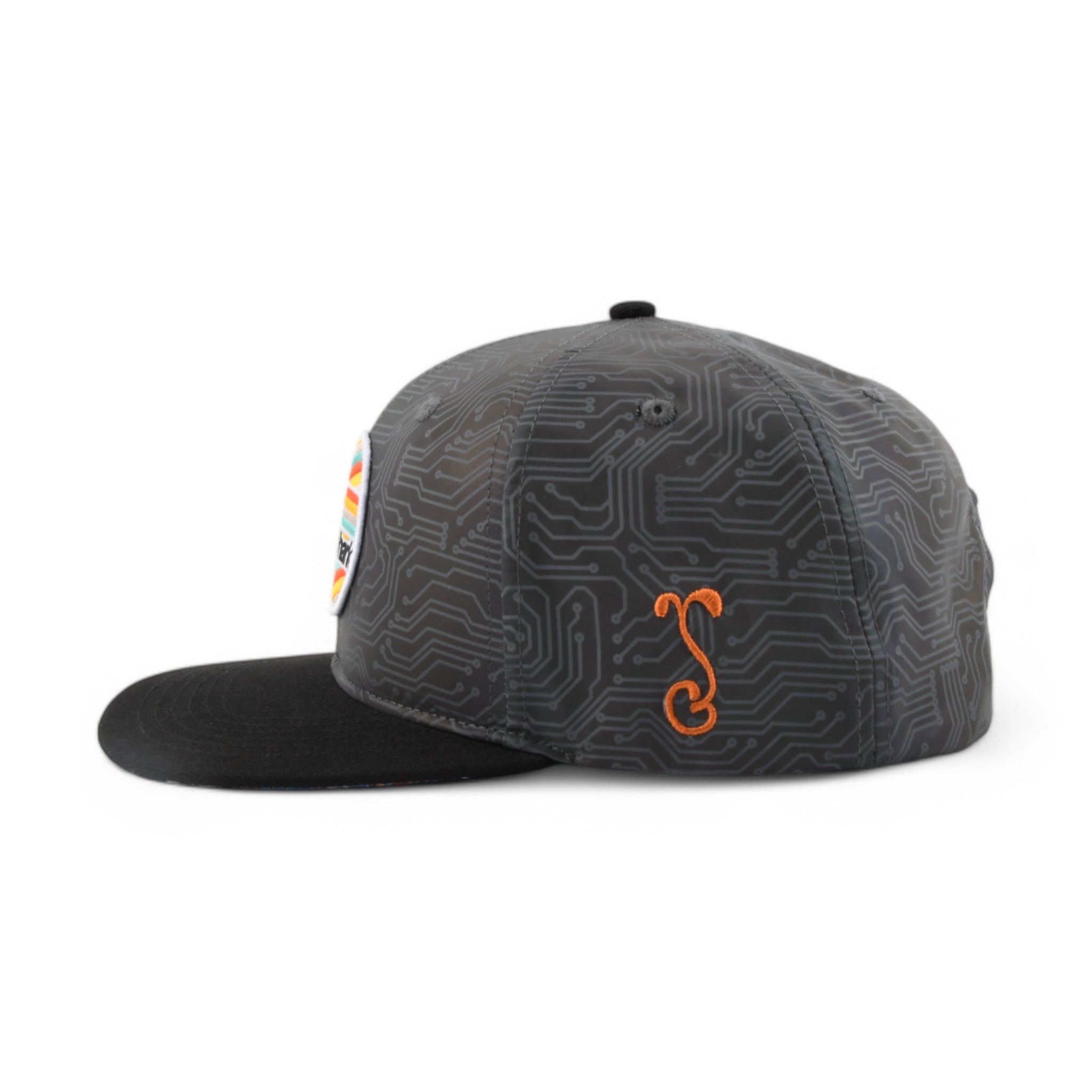 These hats use reflective material on the exterior of the hat, highlighting the circuit board design with a fun reflective material to really make the hat pop