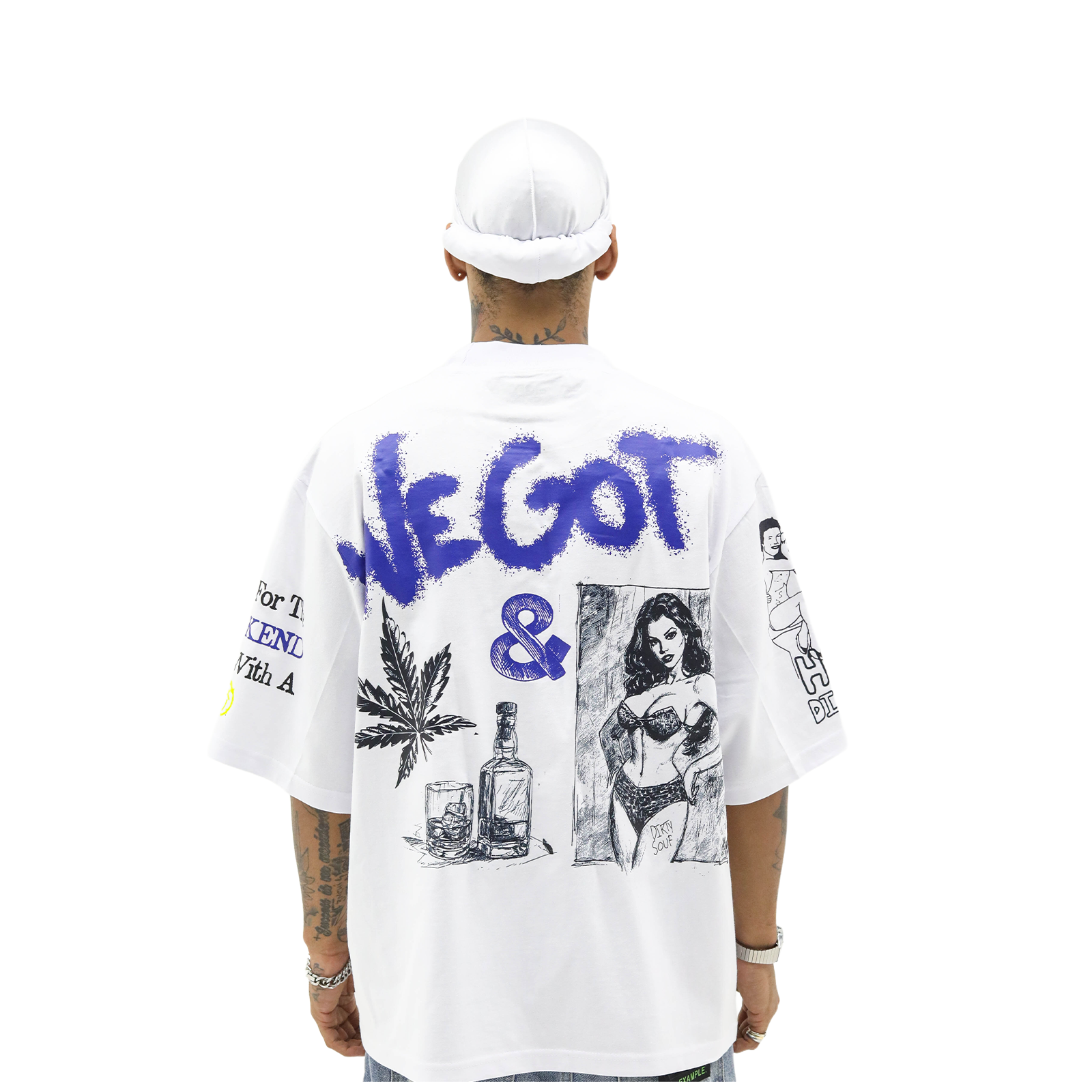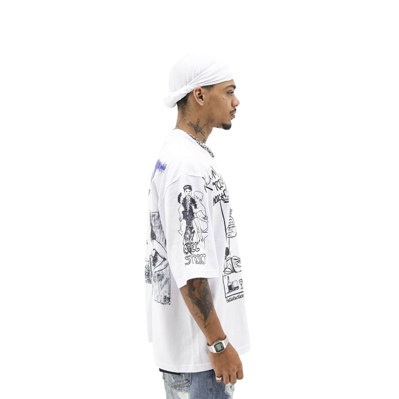 The front features a raw, hand-drawn scene of the infamous Hotel District‚ an imagined playground of vices. Flip it over and you‚ find a spray-paint-style back graphic, dripping with Dirty Souf energy. A custom embroidered patch is sewn into the hem to seal the deal.