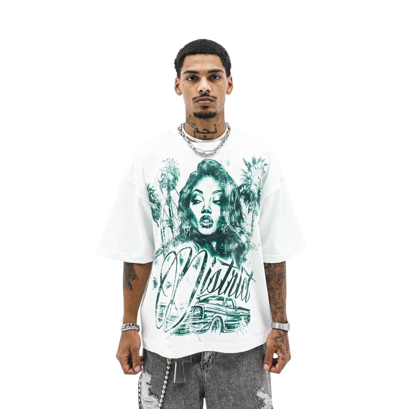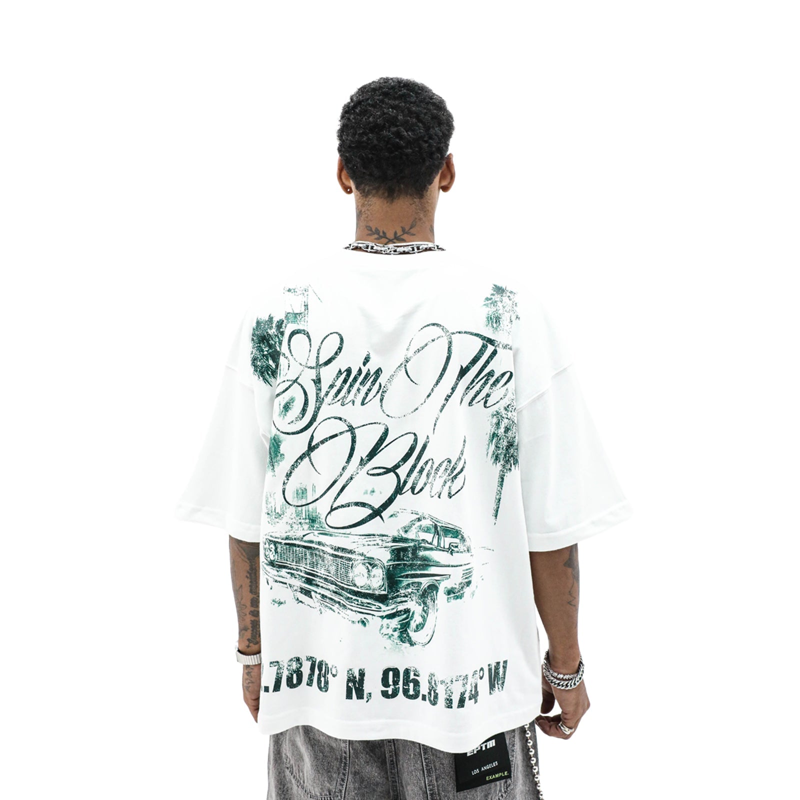 This one‚ for the city. Spin The Block brings old school art vibes with a twist of modern grit. Featuring a throwback-style portrait and lowrider on the front, finished with‚ District‚script. The back hits with a clean‚ Spin The Block‚callout, matching coordinates from our flagship shop in Dallas. This piece is built on our signature 9.0 oz handmade tee‚heavy, structured, and true to fit.