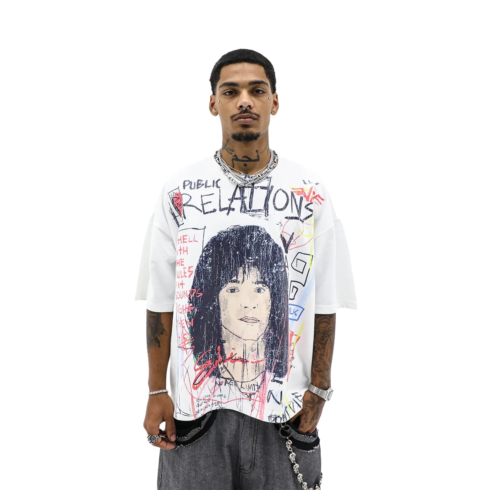 We did not follow the rules with this one. Printed on our 9.0 oz designer tee with drop shoulders, oversized feel, and true to size fit.¬†Featuring a hand-drawn portrait and layered graffiti-style text, this tee is loud, raw, and rebellious. ‚To Hell With The Rules‚ is stamped emphatically on the front while ‚Public Relations‚ sits subtly on the back. A true standout for those who move different.