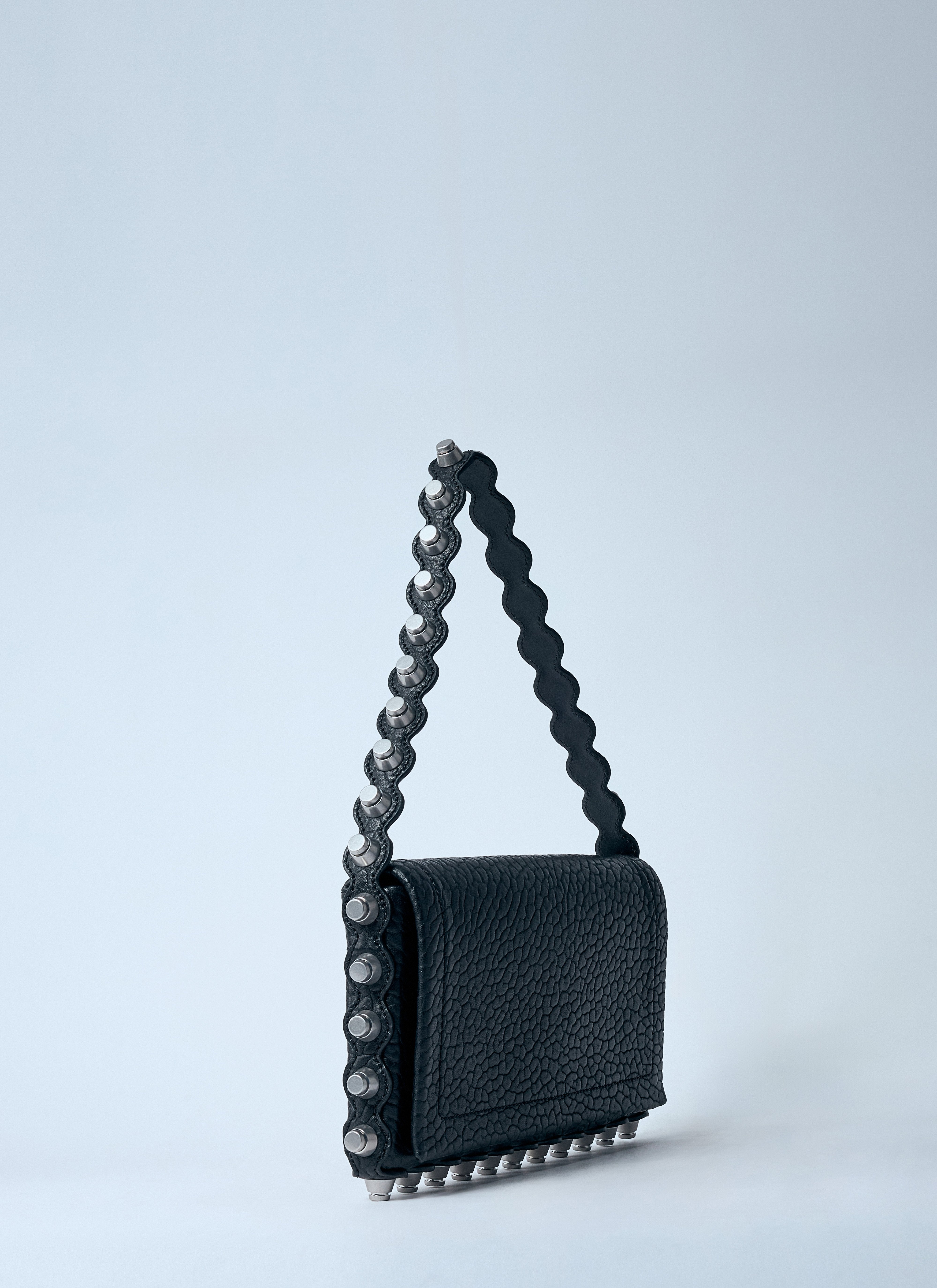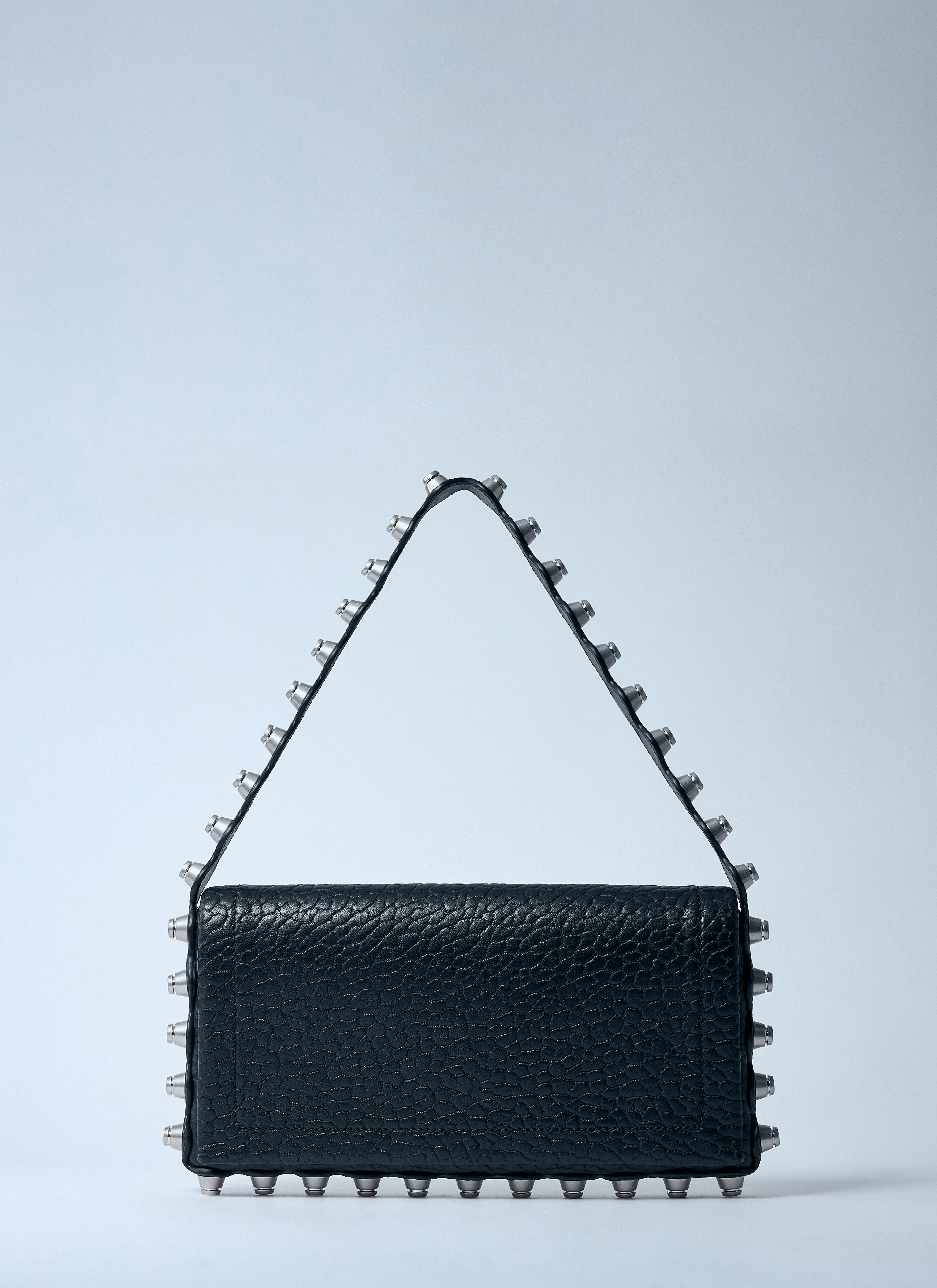 Pebble-grain leather with stud trim.