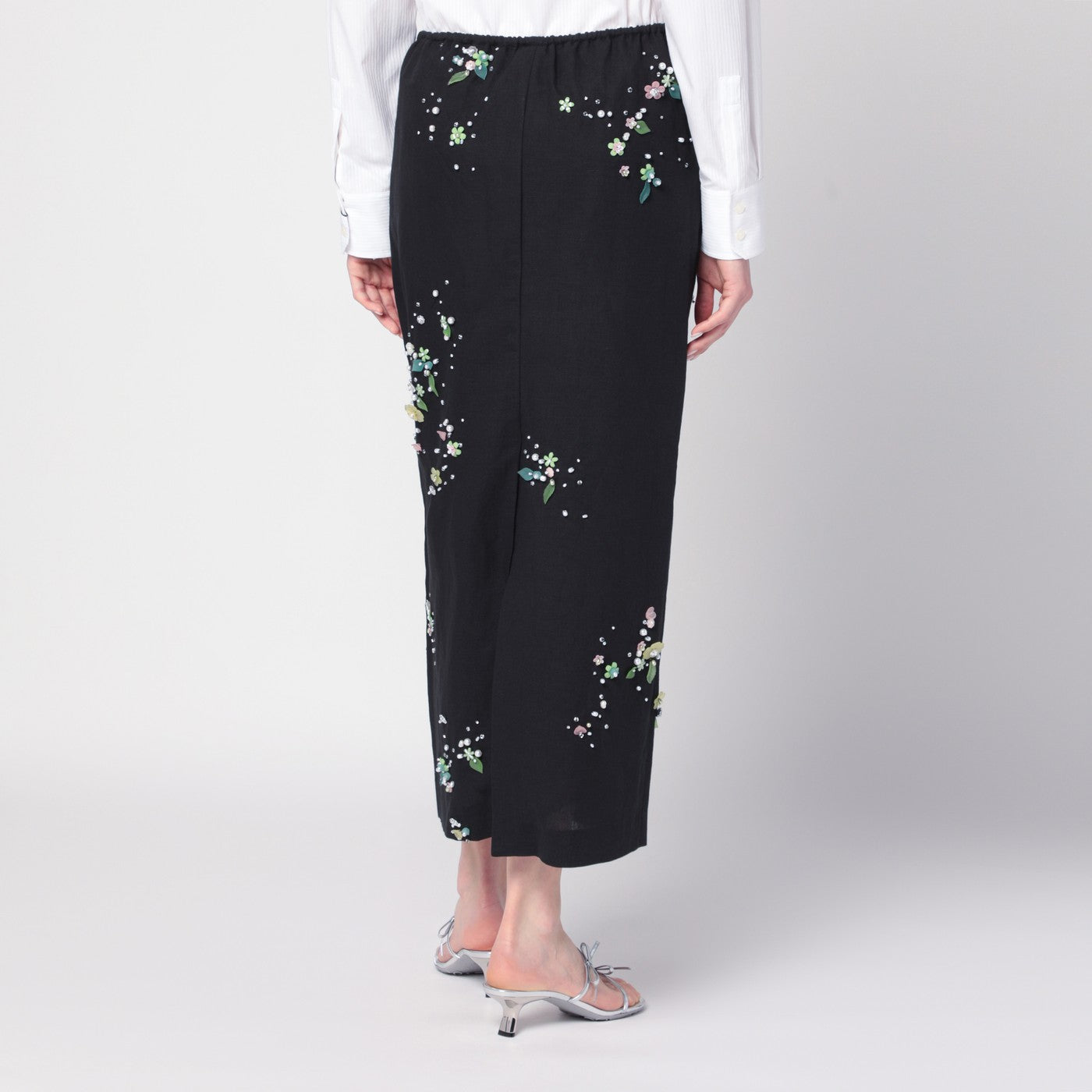 Black cotton and linen midi skirt by Bernadette featuring all over beaded embroidery elasticated waist and back slit.