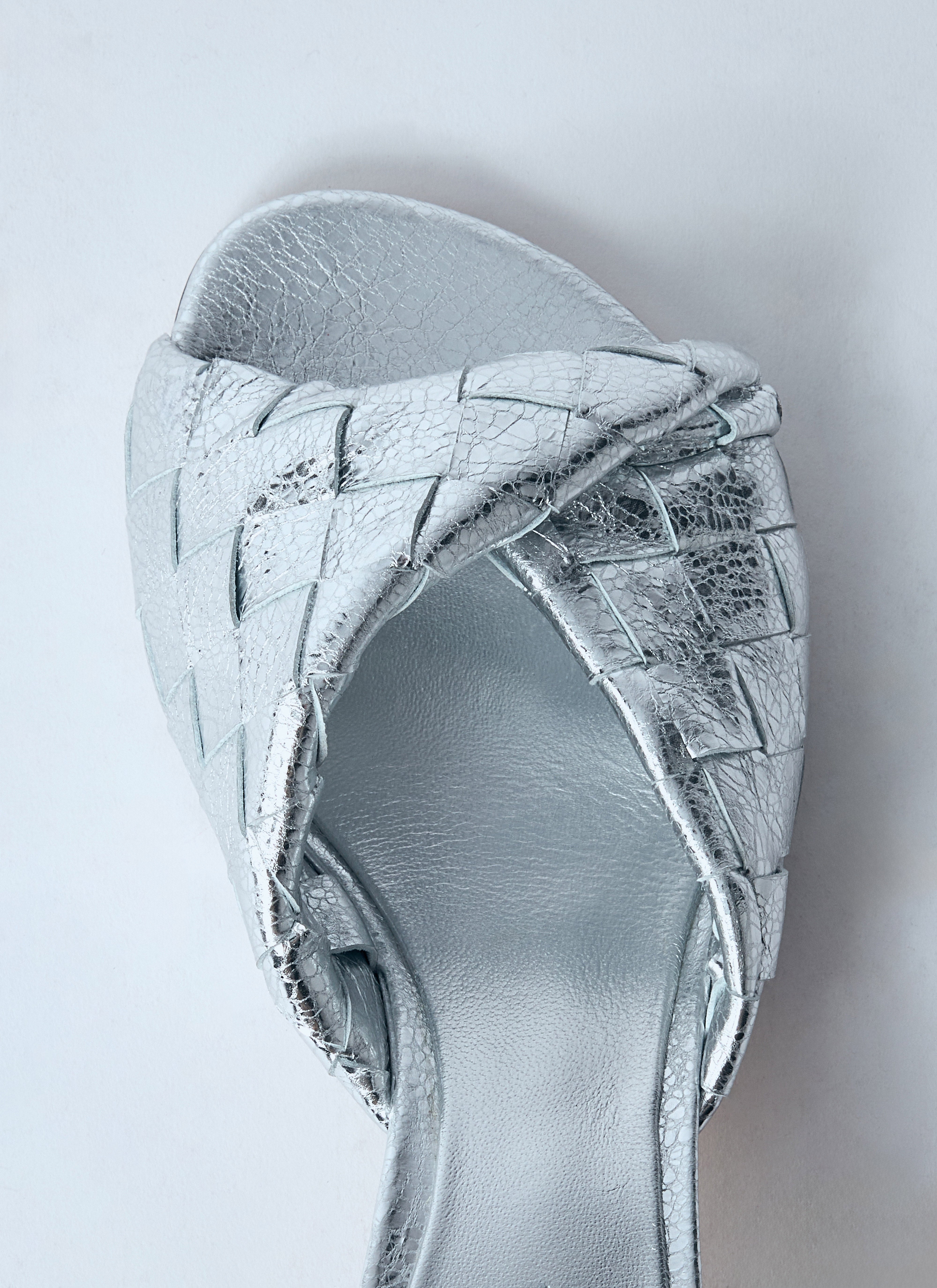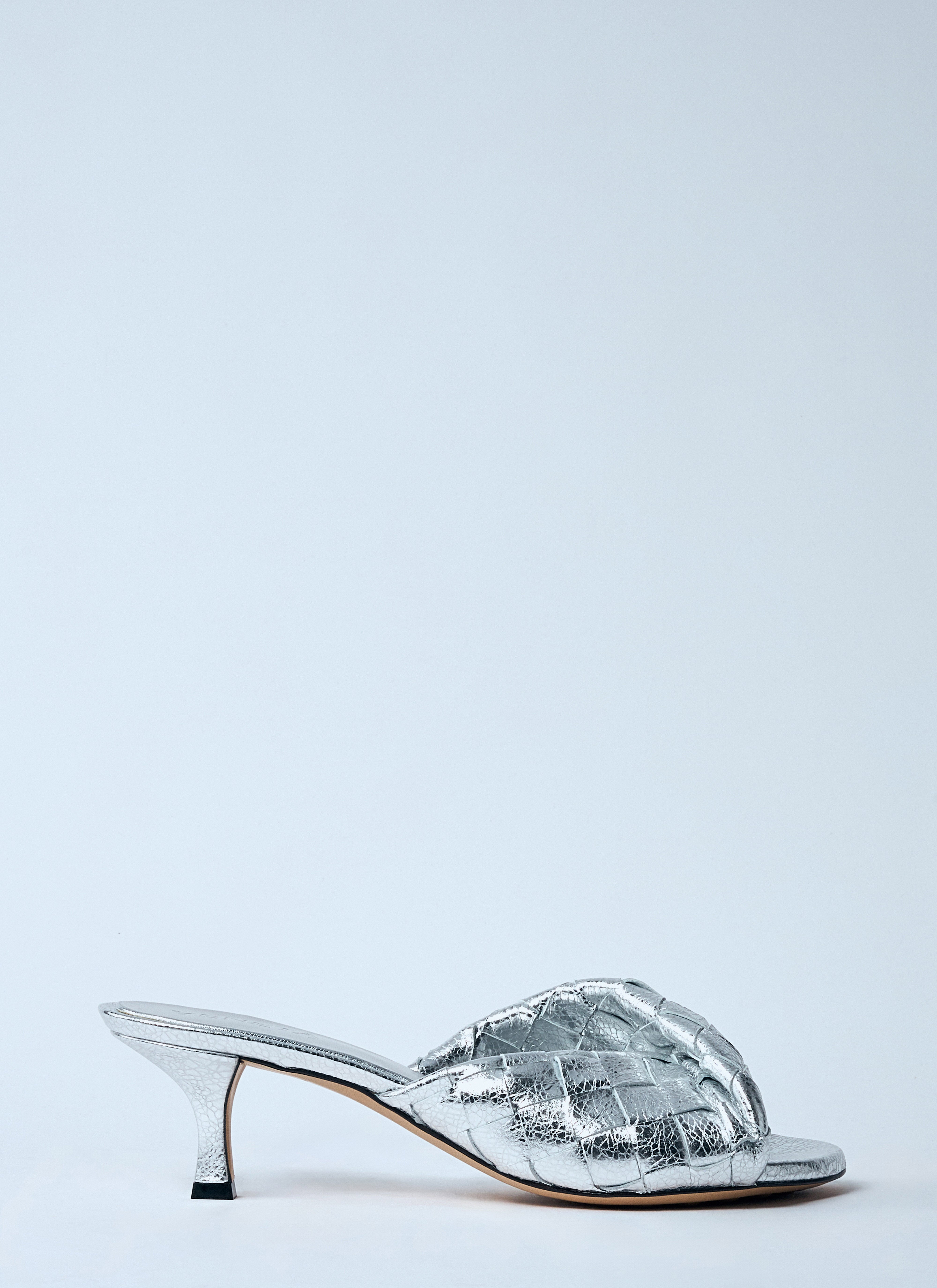 Blink heeled mules in intrecciato woven leather with metallic finish.