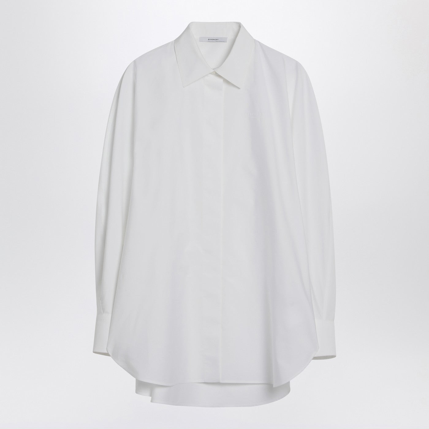 Wide Givenchy white cotton shirt characterized by hidden front buttoning long sleeves with buttoned cuffs and a curved hem that is longer at the back.