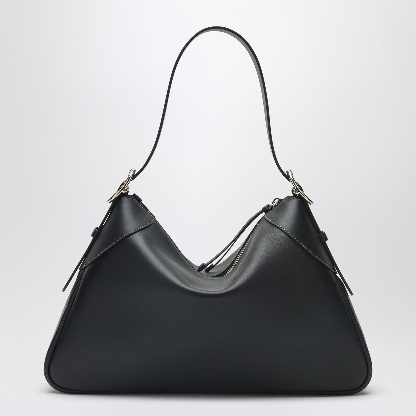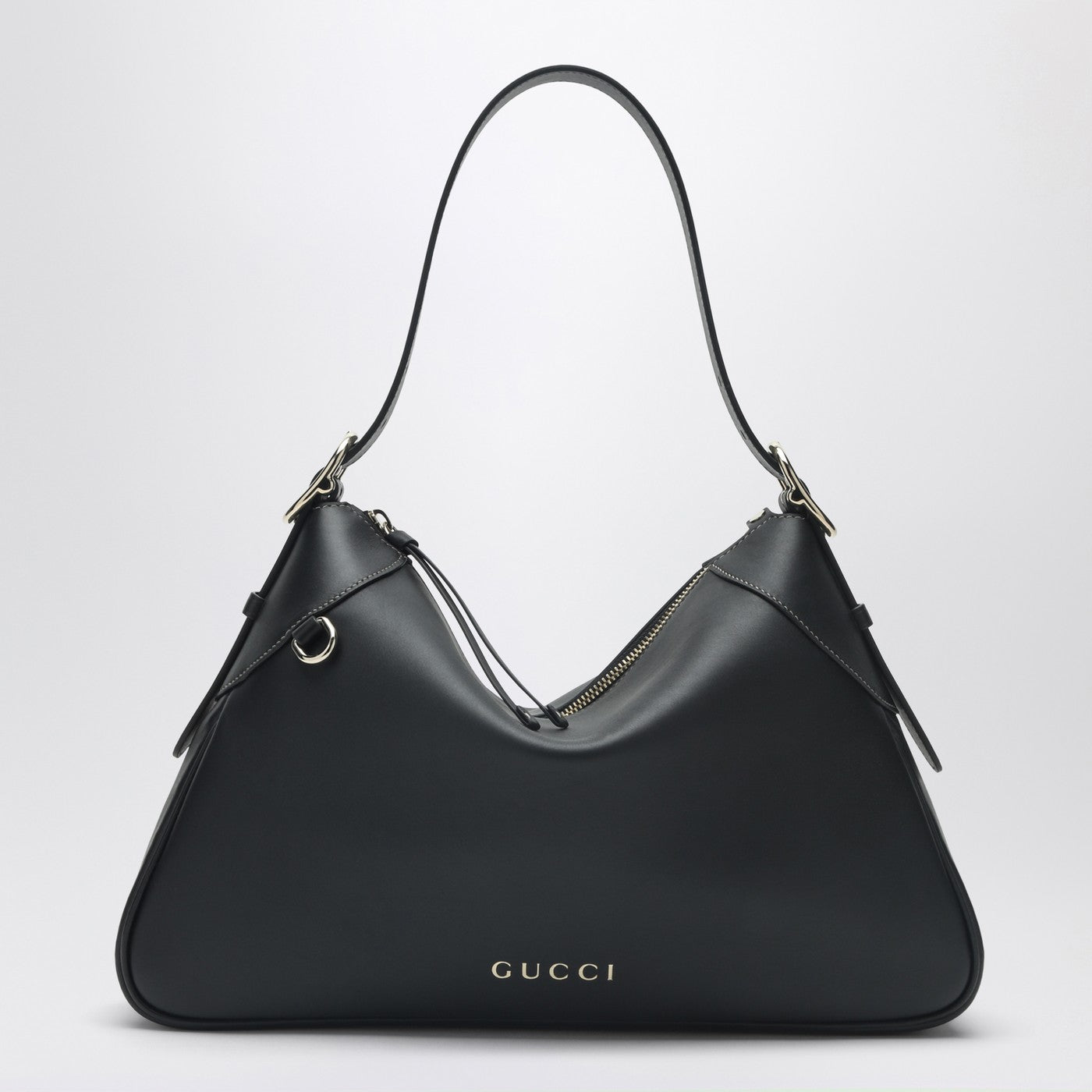 Gucci black leather shoulder bag characterized by contrasting stitching adjustable shoulder strap with side buckles front logo lettering metal D-ring zip closure and an internal zip pocket.