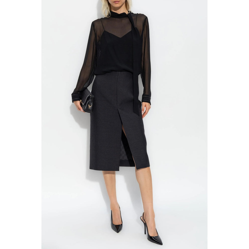 grey wool-silk blend concealed rear zip fastening front slit straight hem mid-length pencil silhouette