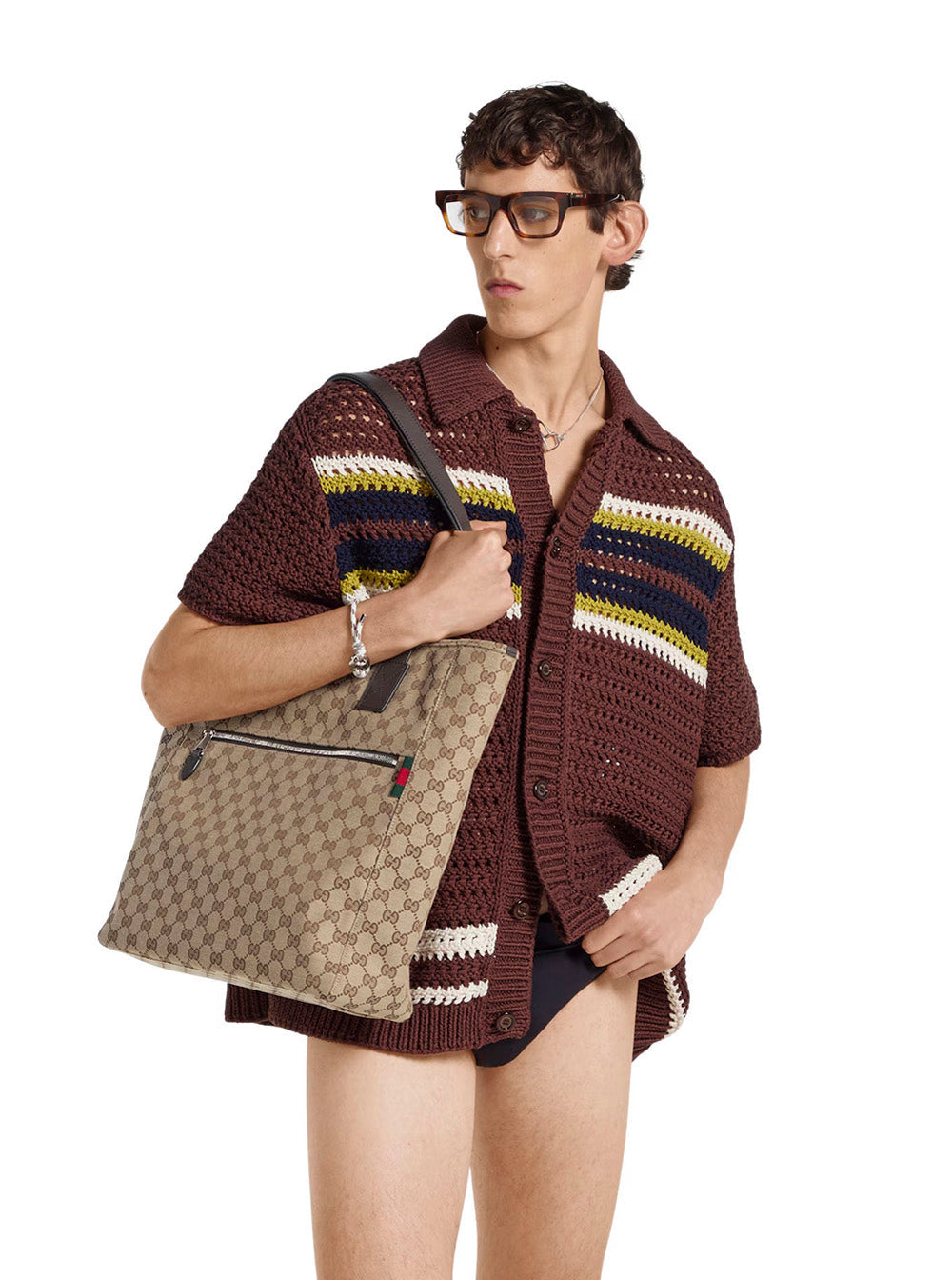 Gucci Men Beige Tote Bag With Two Top Leather Handles And Front Zip Pocket In Gg Canvas Man