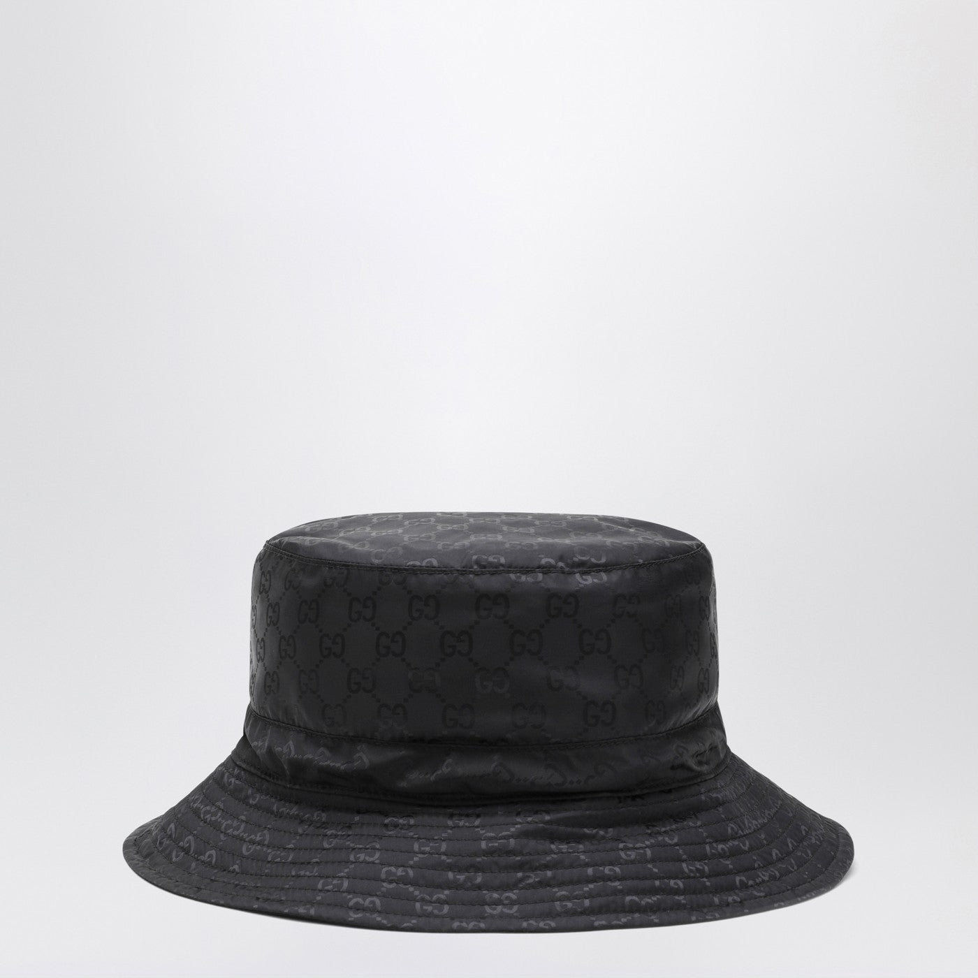Gucci black nylon fisherman hat characterized by a tone-on-tone GG pattern on one side a logo lettering tag on the other adjustable drawstring reversible and foldable design with a ring.