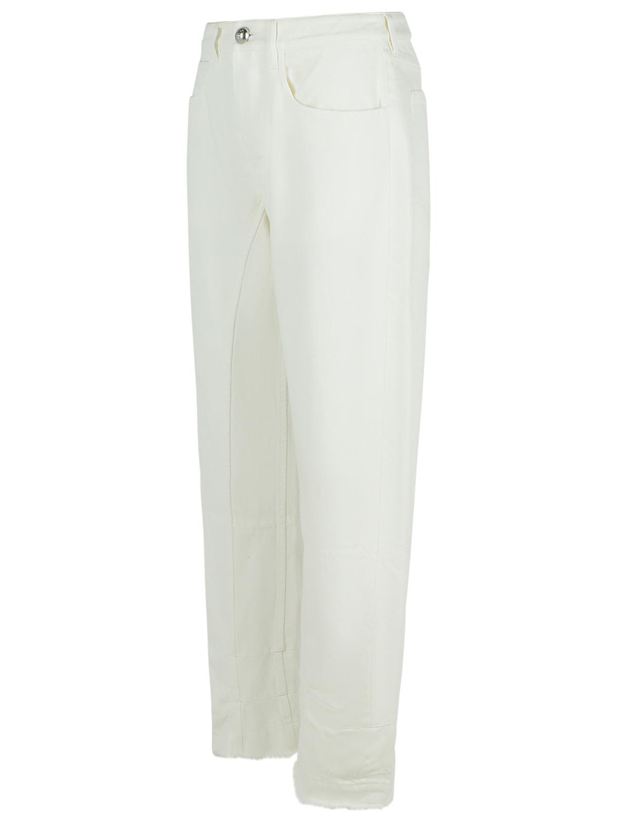 Belt loops, five-pocket concealed flap button closure, tonal inserts, frayed hem, logo tag on the back