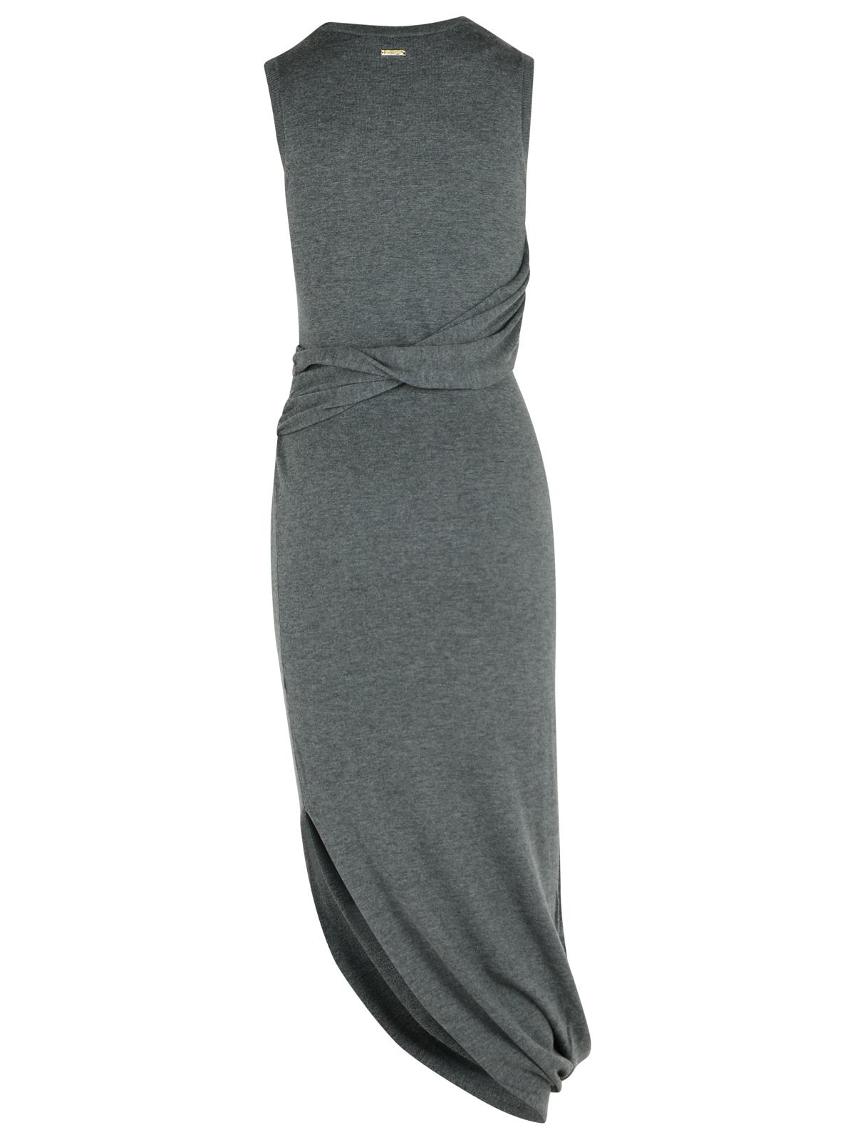 Enveloping dress with draped detail, fine knitted, tight silhouette, gathered hem at the bottom with side slit