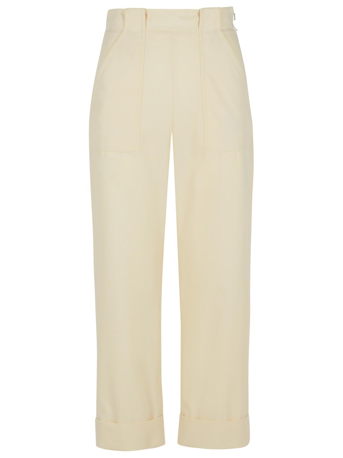 Belt loops, side zip closure, two slit pockets, tonal hem