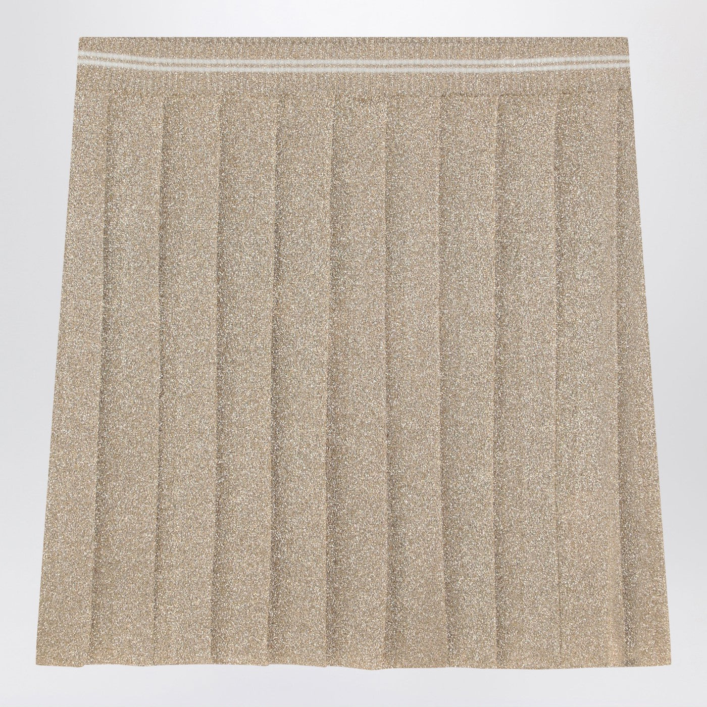 Gold lurex mini skirt by Miu Miu featuring a pleated design elasticated ribbed waistband and contrasting front logo inlay.