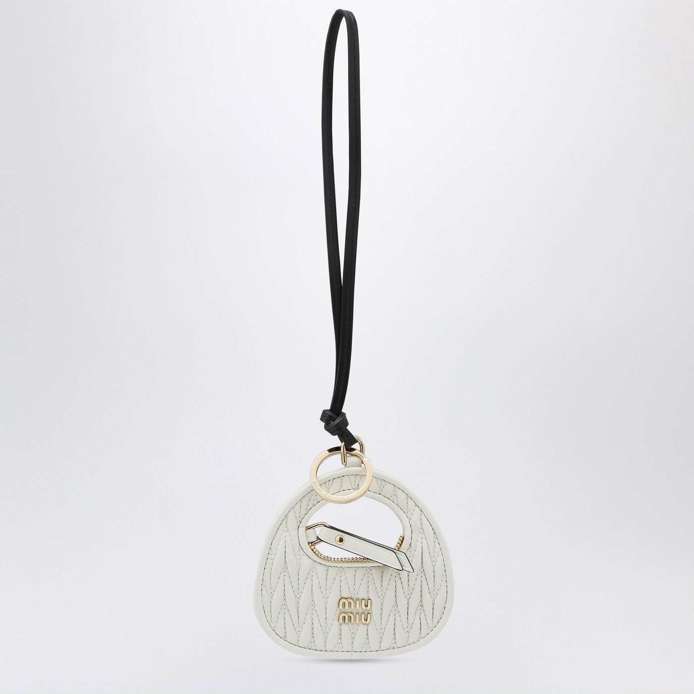 Miu Miu white leather trick characterized by quilted workmanship a ring with a strap a mirror on the back and a metal lettering logo on the front.