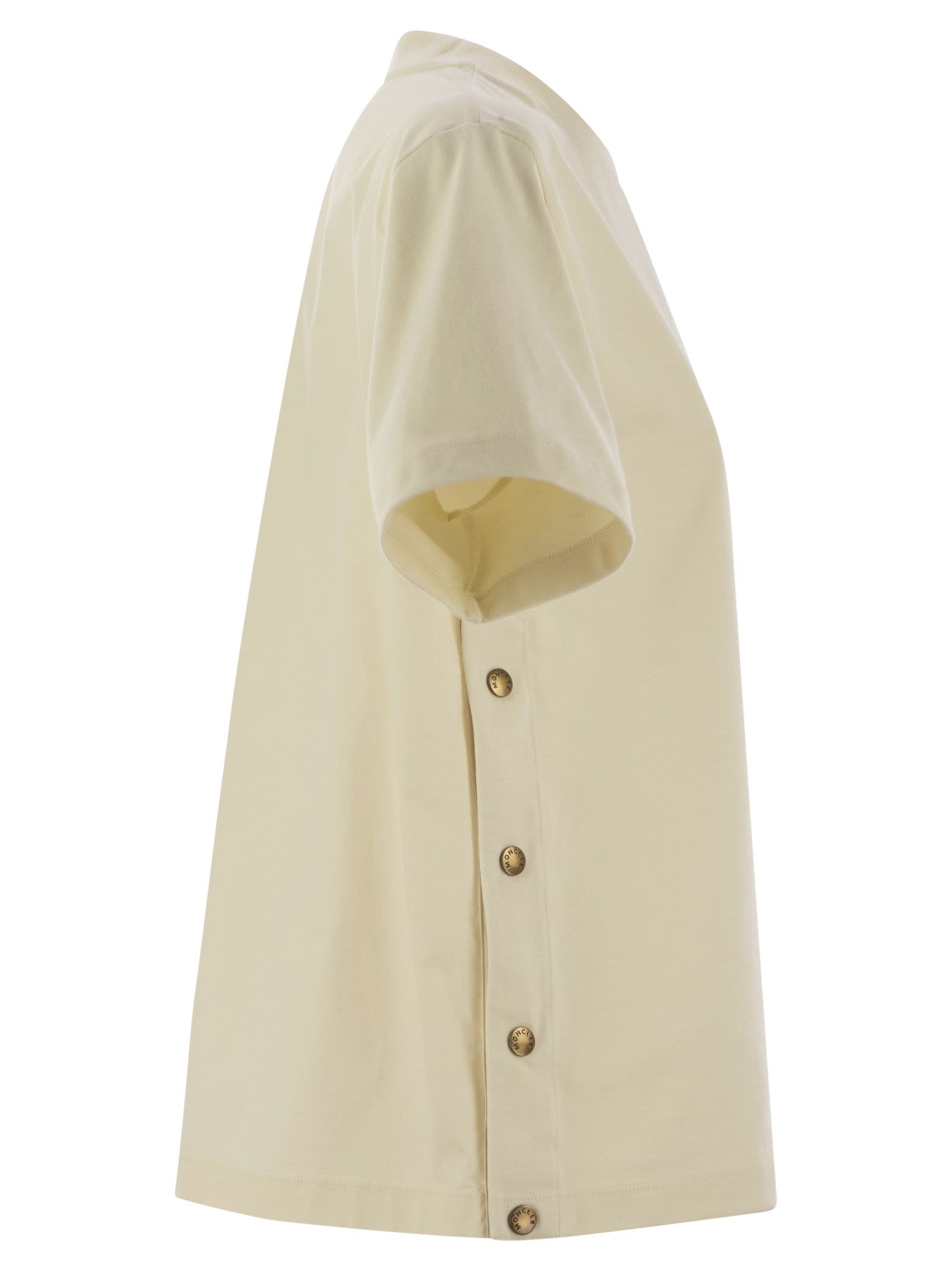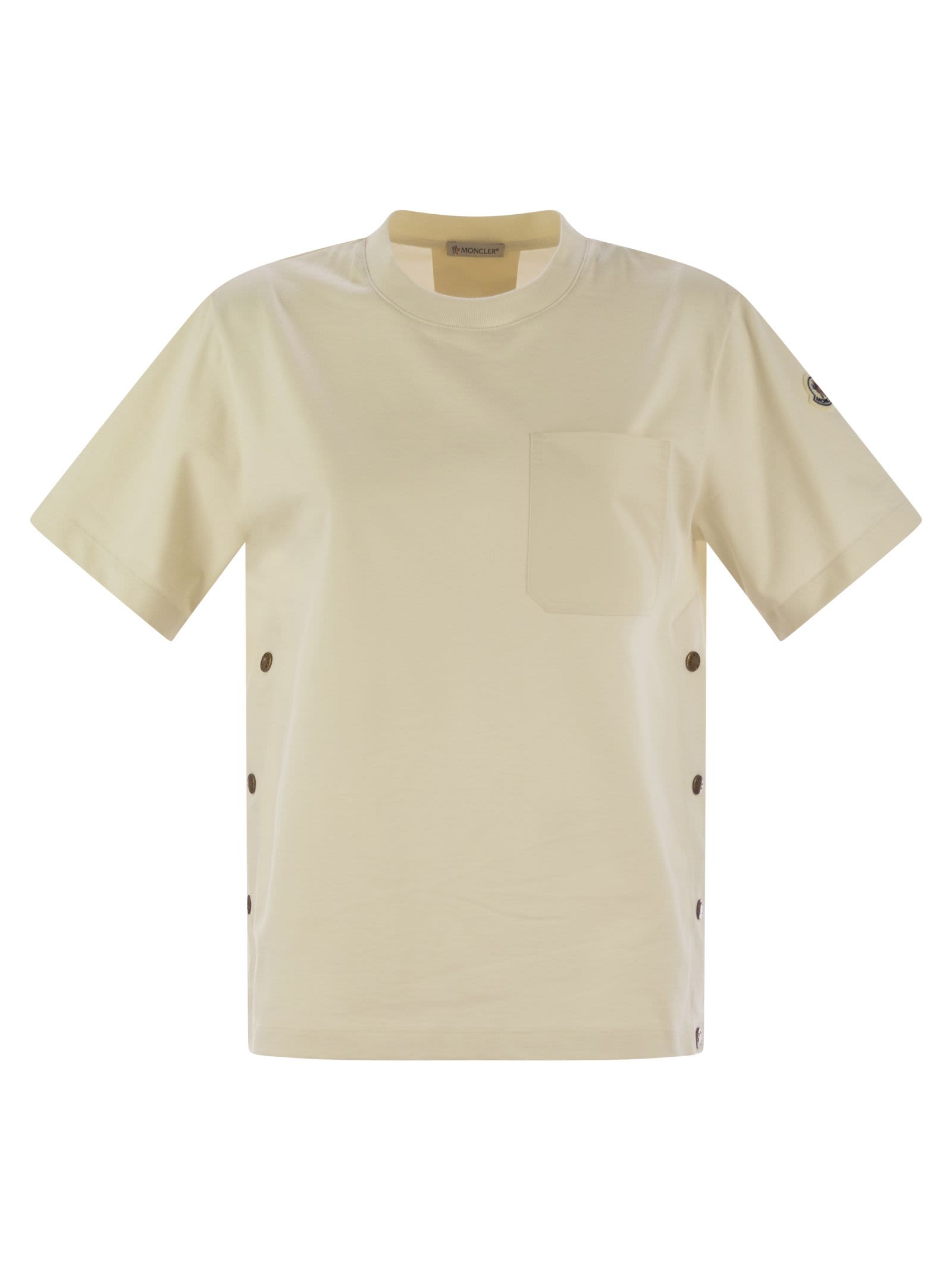 This T-shirt can be opened at the sides thanks to press studs and is a versatile garment perfect for mid-season. The classic crew neck is further enhanced by a patch pocket on the chest. - Made of cotton jersey - Crew neck - Short sleeves - Side snap button closure - Chest pocket - Wide fit DESIGNER ID: K10938C0002089A4U 050