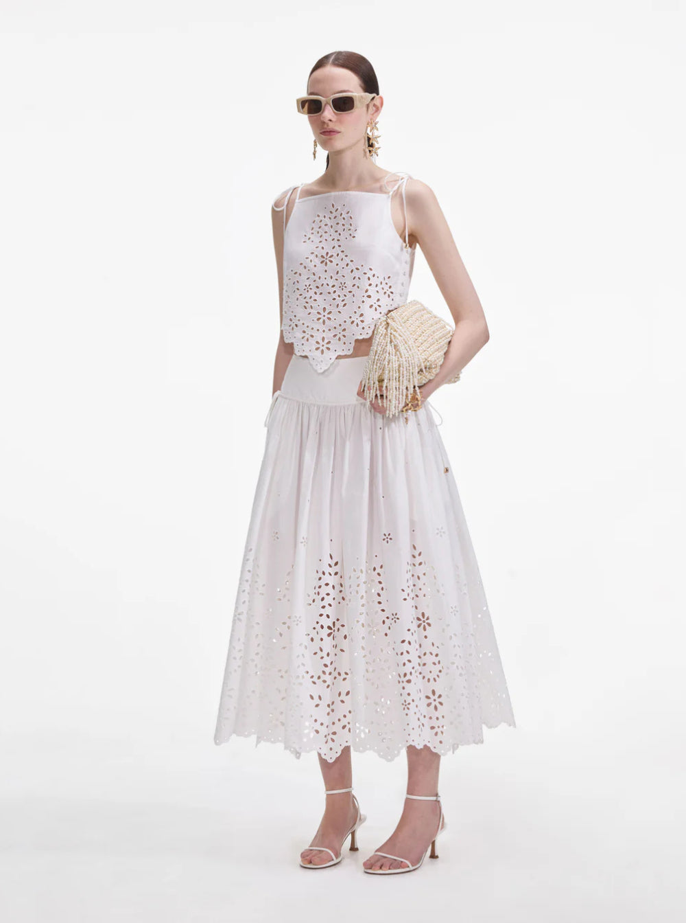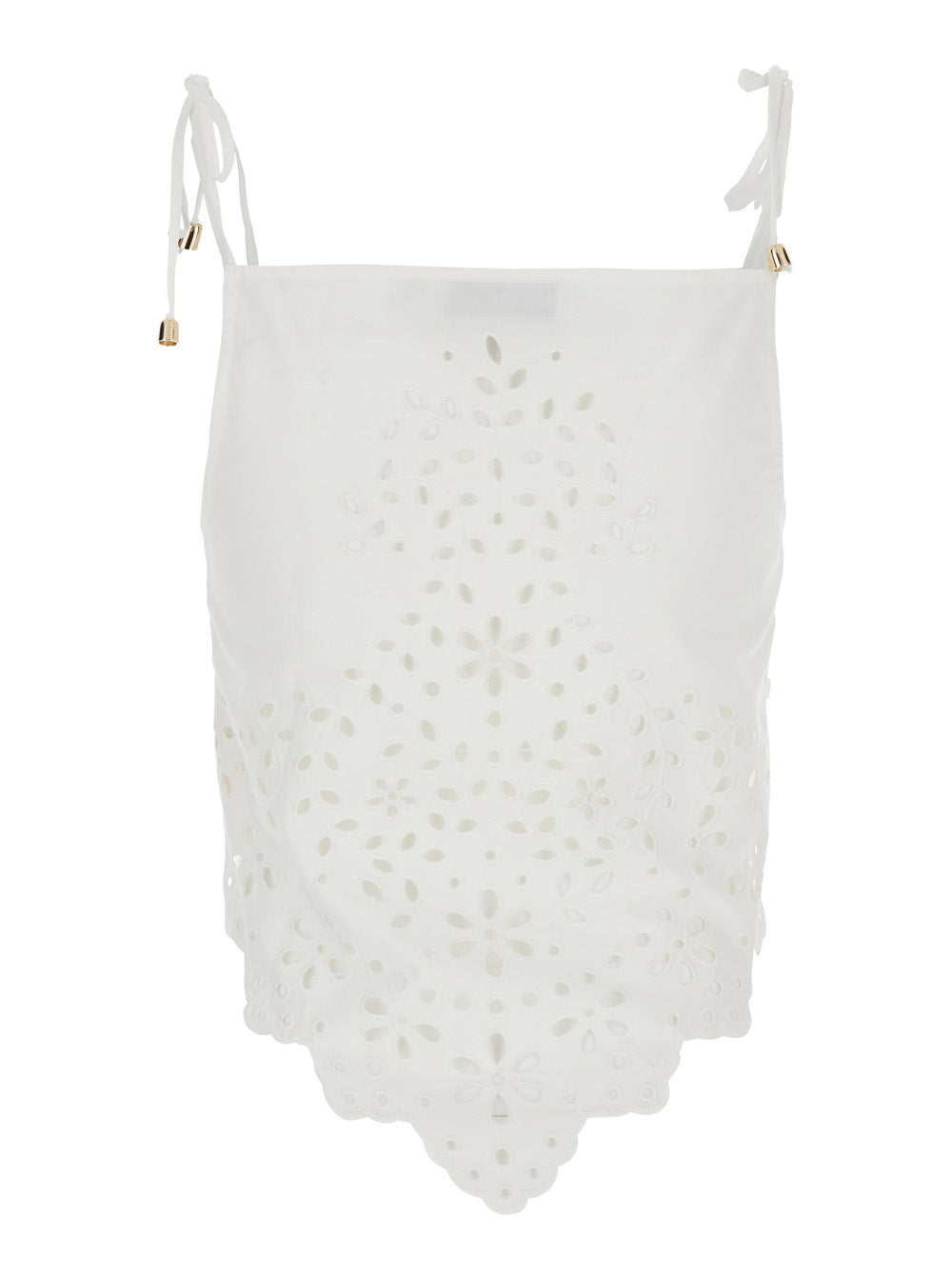 Top White Adjustable shoulder straps with ties Sleeveless Asymmetric hem All-over embroidery Cotton Relaxed fit