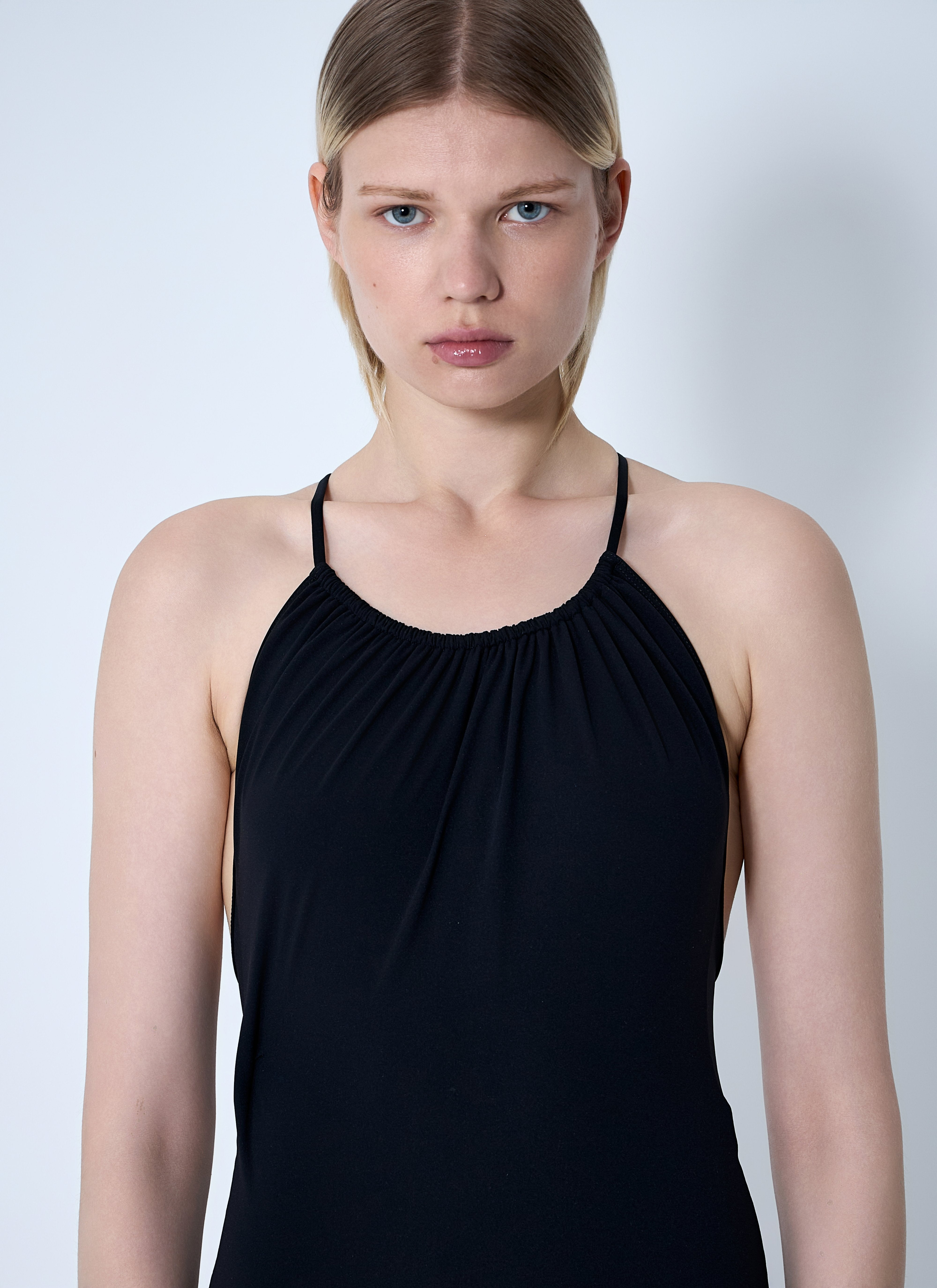 Stretch-finish swimsuit with drawstring neck construction.
