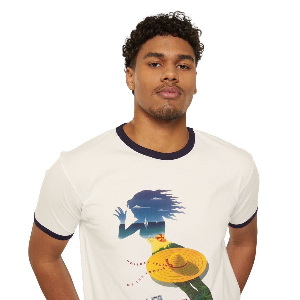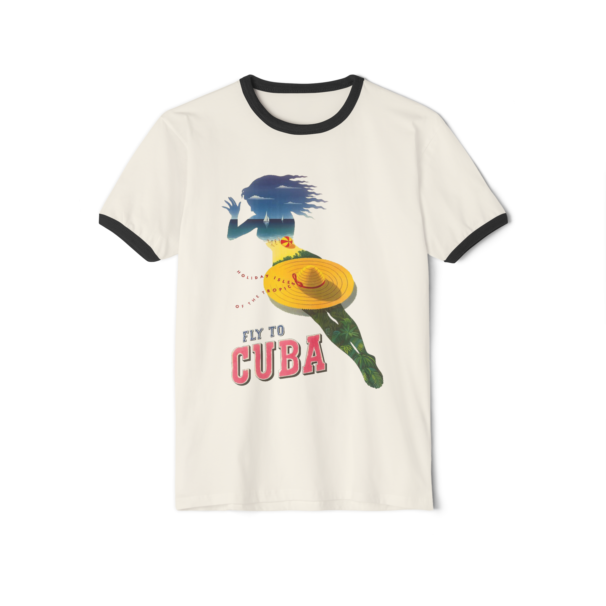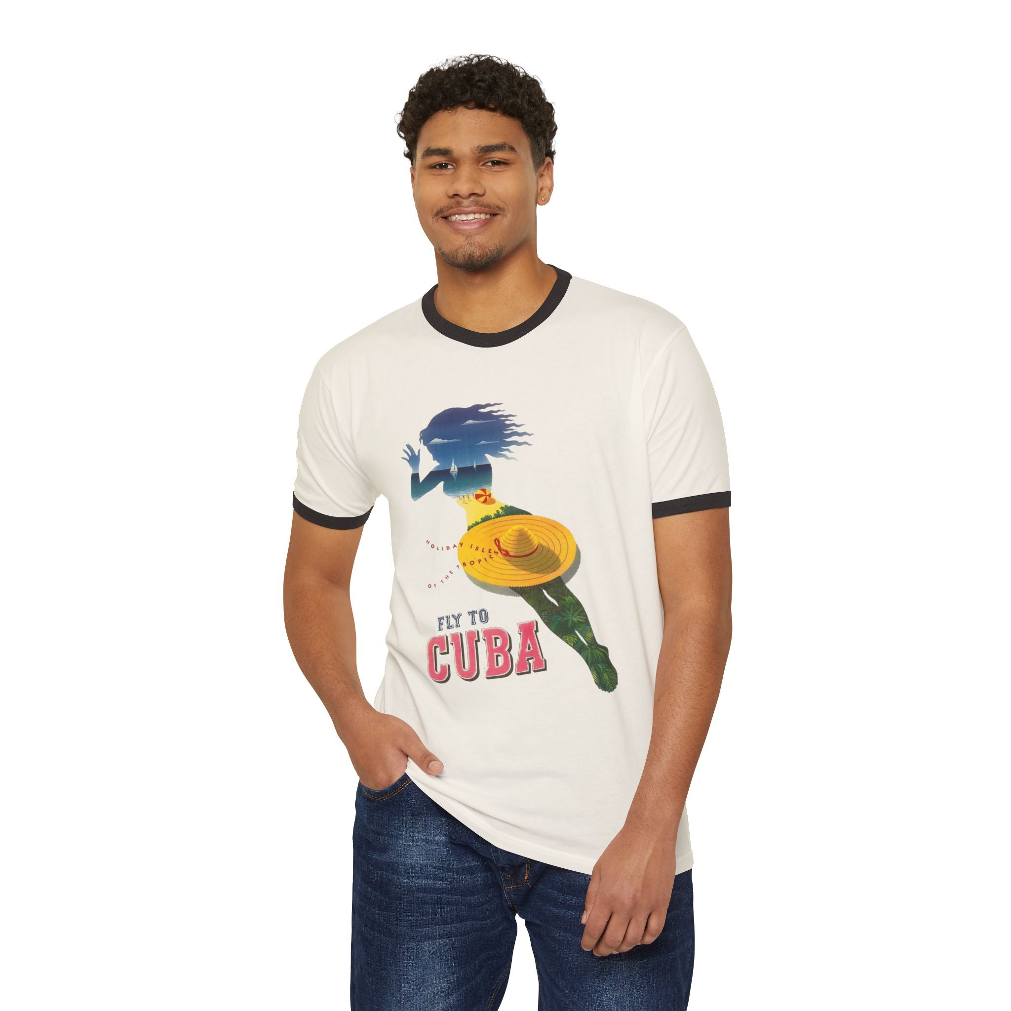 Step back into the golden age of travel with this timeless ringer tee featuring Fly to Cuba – Holiday Isles of the Tropics, a vintage-inspired design by Julius Seyler from Retro Graphics. Made from 100% ring-spun cotton, this shirt combines soft comfort with durable quality. The contrasting 1x1 baby rib binding on the collar and sleeves adds a bold retro touch, making it perfect for everyday wear or as a standout statement piece. Whether you’re a lover of vintage travel posters, Cuban culture, or classic style, this tee brings iconic mid-century flair into your modern wardrobe.