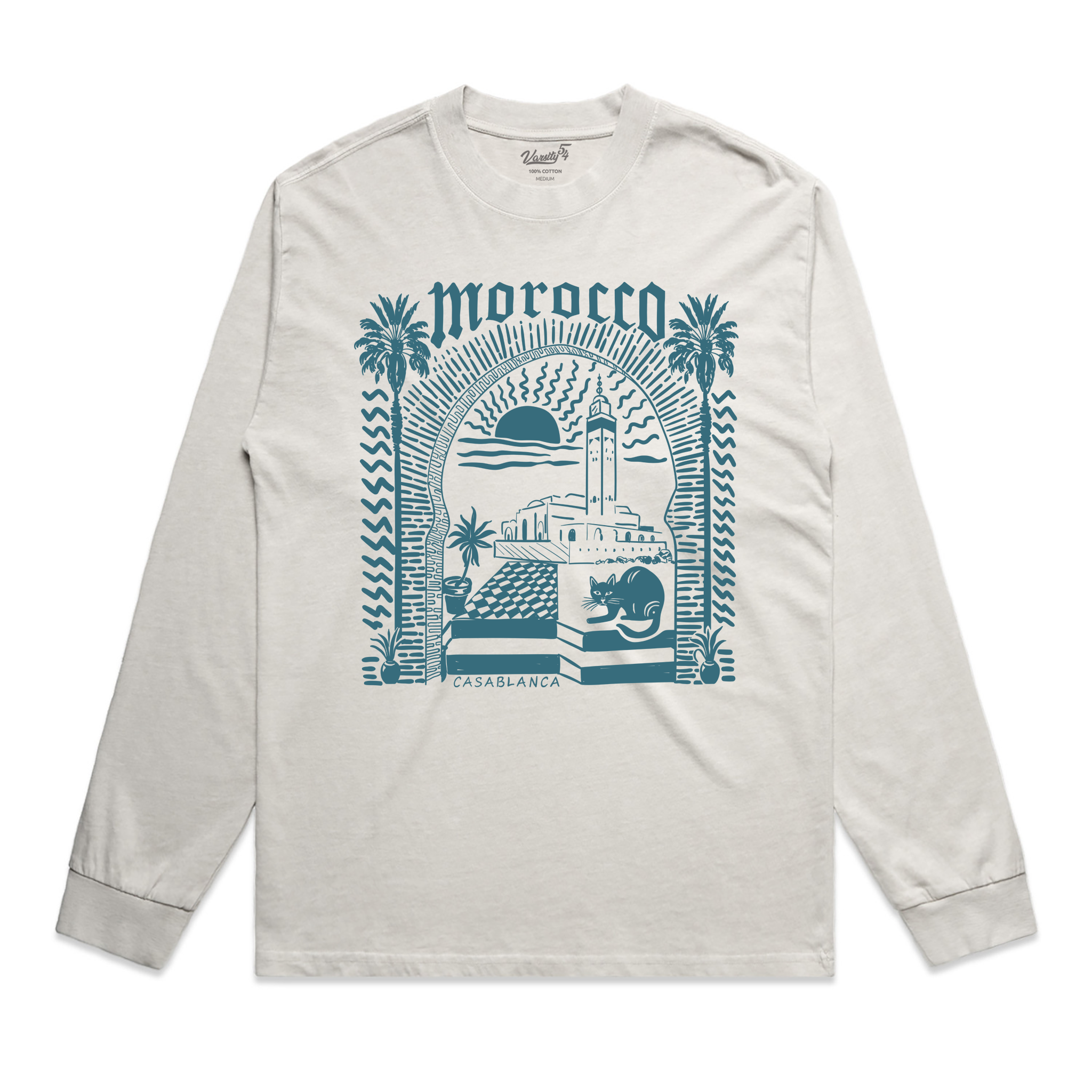 Celebrate the spirit of Morocco with this premium heavyweight long sleeve tee. Crafted from 100% carded cotton for lasting softness and durability, it’s garment-dyed for a lived-in feel and rich, vintage character. The boxy, relaxed cut features a wide twin-stitched neck ribbing for a modern, easy silhouette. A bold, sun-washed graphic of Casablanca’s iconic skyline adds a distinctive, travel-inspired edge.