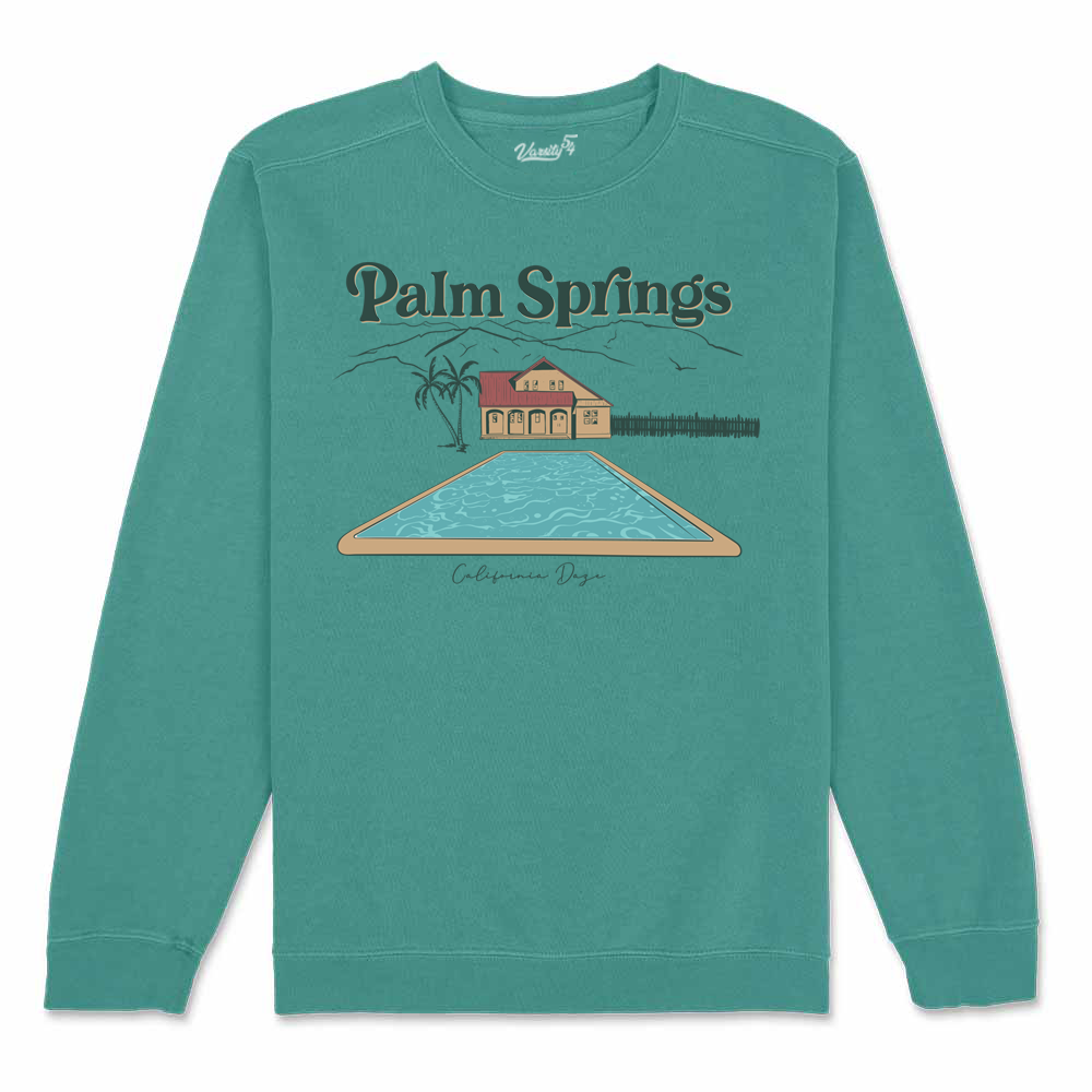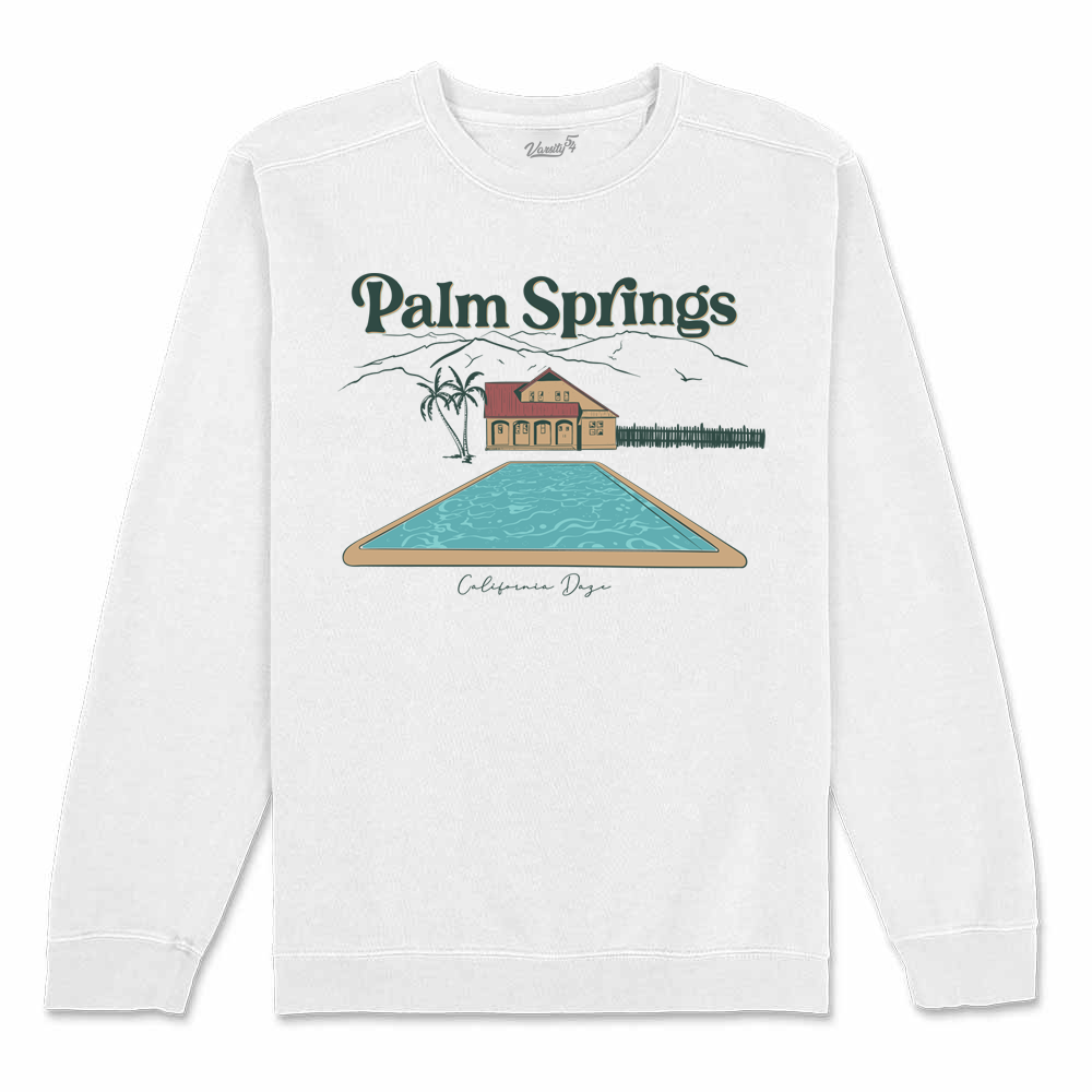 The beauty is in the simplicity: clean architectural lines, desert mountains sketched in the distance, and that signature script lettering that whispers of California cool. It's the kind of piece that instantly transports you to those golden hour moments by the pool.