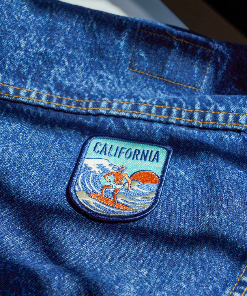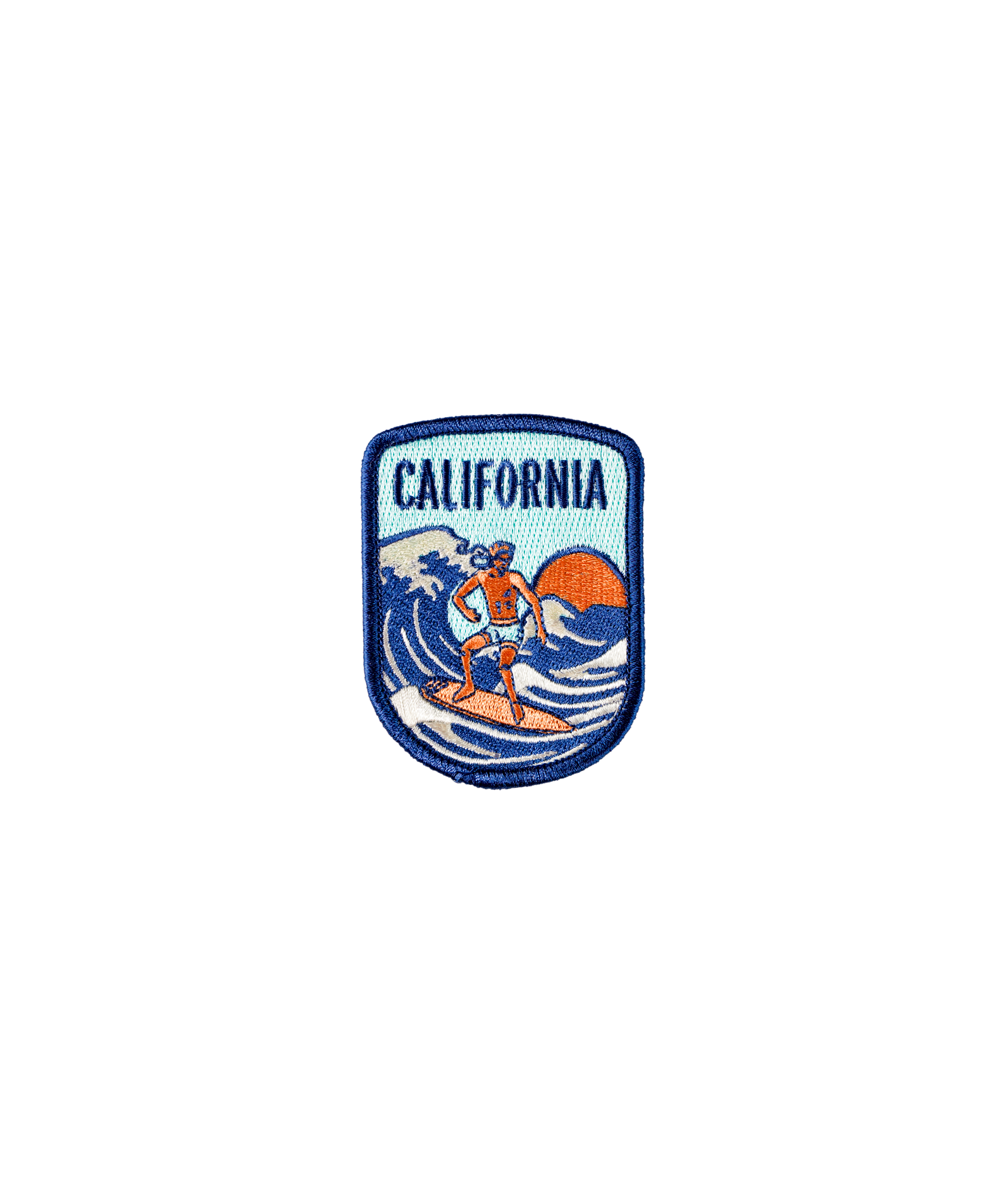 Show off your Californian pride with this blue and orange embroidered patch. Inspired by the vintage patches we have sourced over the years this patch features a man surfing a huge wave. What could be more California than that?!