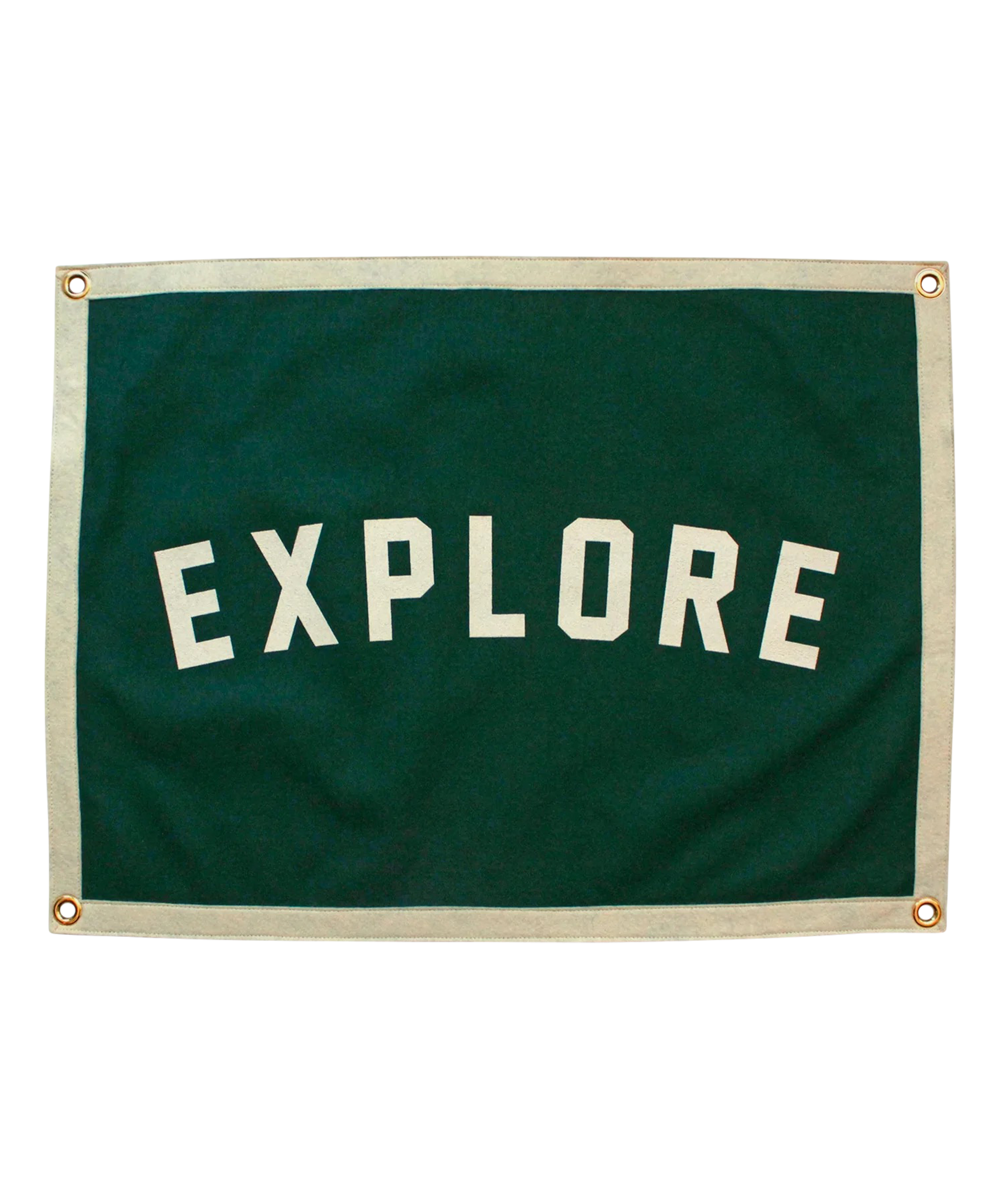 This forest green and cream Explore camp flag is perfect for explorers, campers, travelers, adventurers, lovers of the outdoors and sufferers of wanderlust.