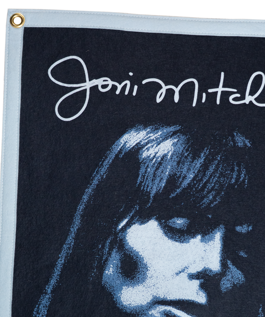 This handmade camp flag honors the timeless work of Joni Mitchell’s Blue, featuring her portrait and her signature graceful script. Hang it where you keep your most treasured music close.