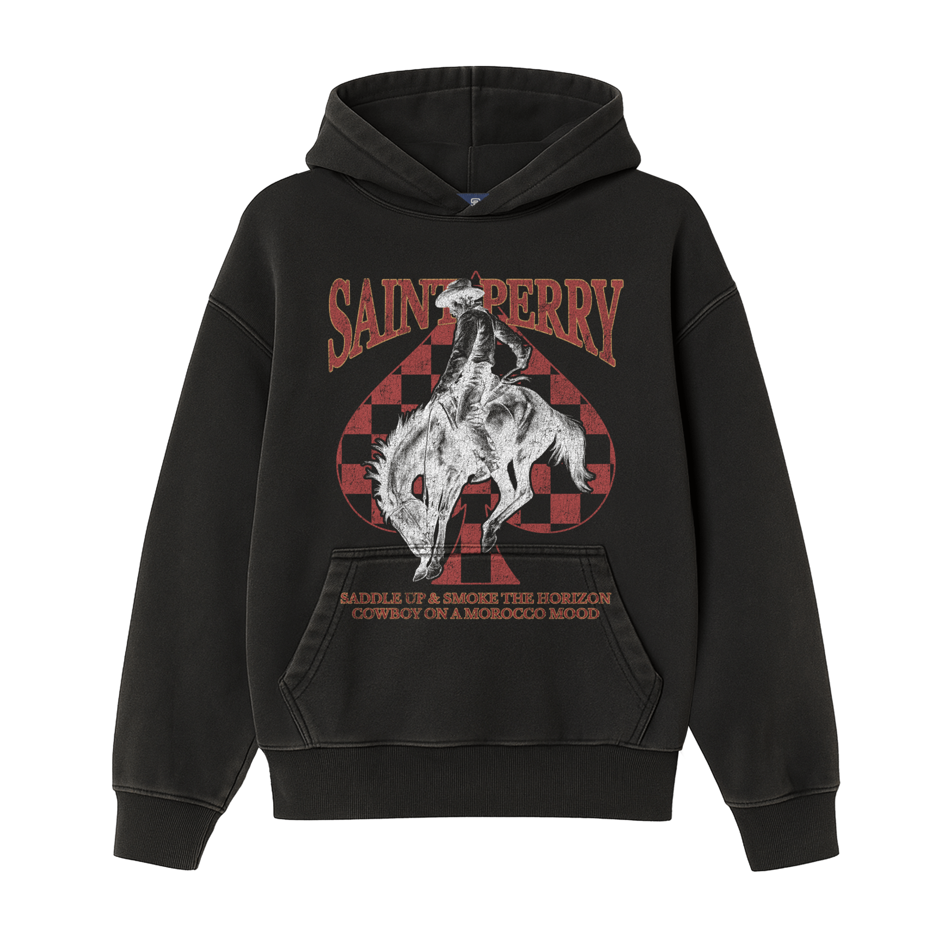 The Horizon Rider hoodie evokes the spirit of open roads and endless pursuit — where dust, sun, and silence forge character. Cut from premium VTG black cotton, its bold front print recalls the weathered insignia of a traveler’s relic: the Horizon Rider Leather Card Case. The silhouette balances rugged attitude with quiet refinement, capturing the essence of Saint Perry’s desert-borne rebellion.