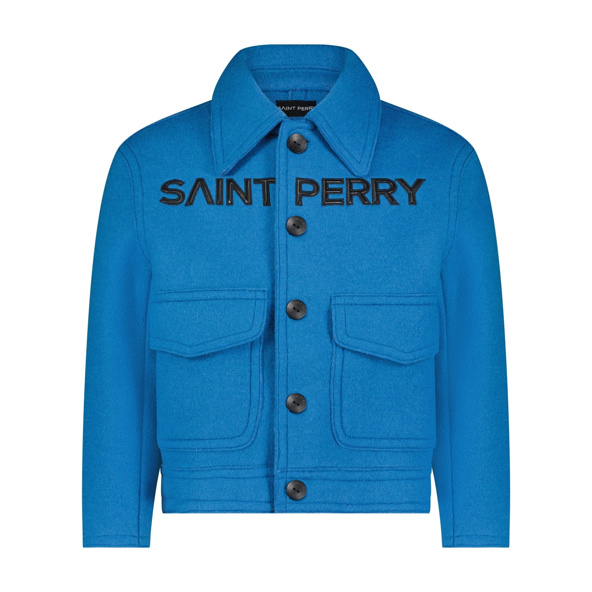 The jacket features SAINT PERRY logo leather embroidery, adding a touch of sophistication and brand identity. It also has a double-faced construction and is hand-sewn for quality craftsmanship.