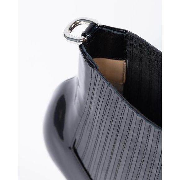 The Epic Boot expresses the designer's passion for high heels and is notable for its slender 100 mm galvanised nickel heel. Crafted entirely in Black patent leather, it is enhanced by a sophisticated pointed toe, leather bands that dress its elastic panel and a ring at the back that allows it to be adorned with a charm.