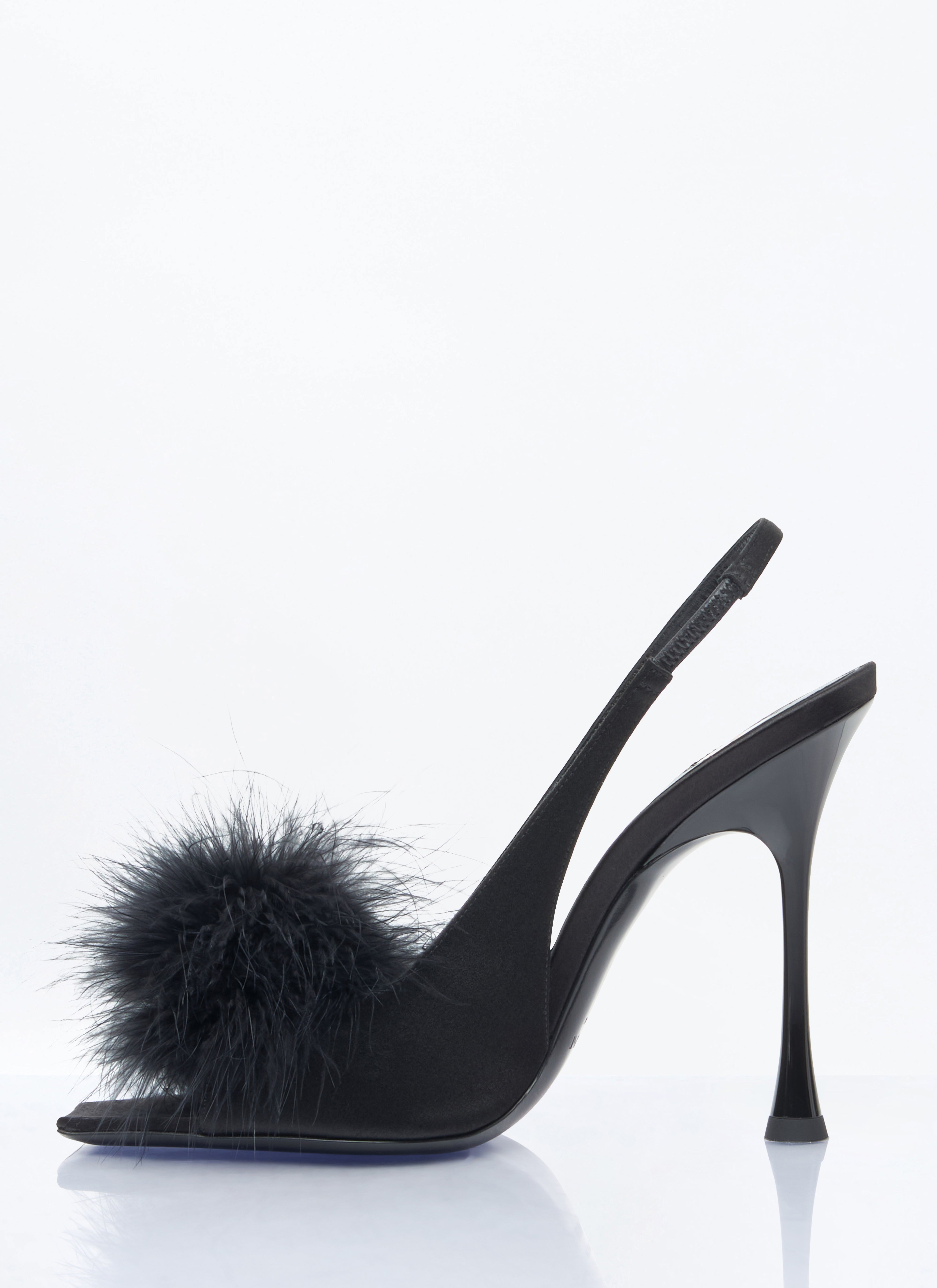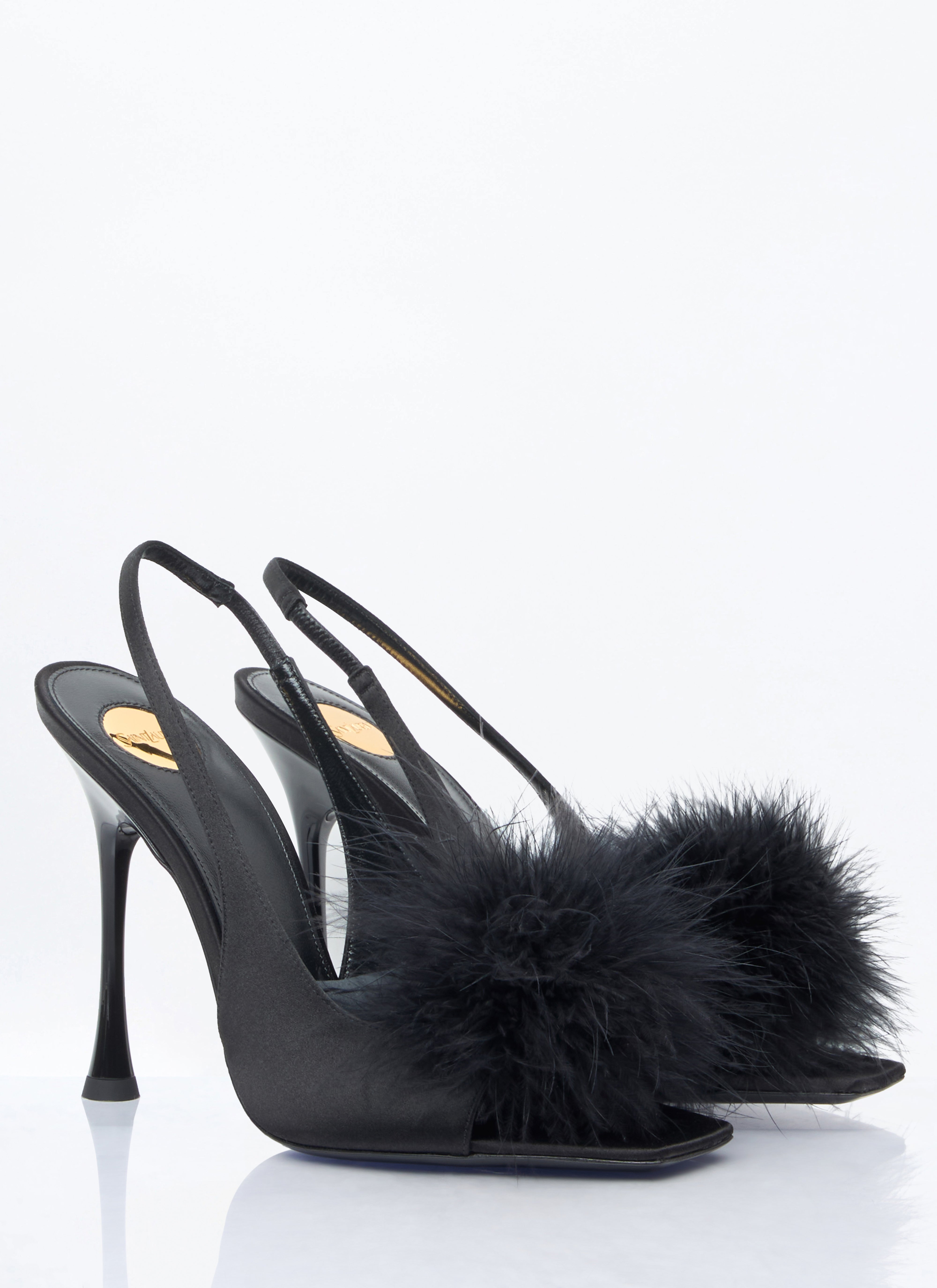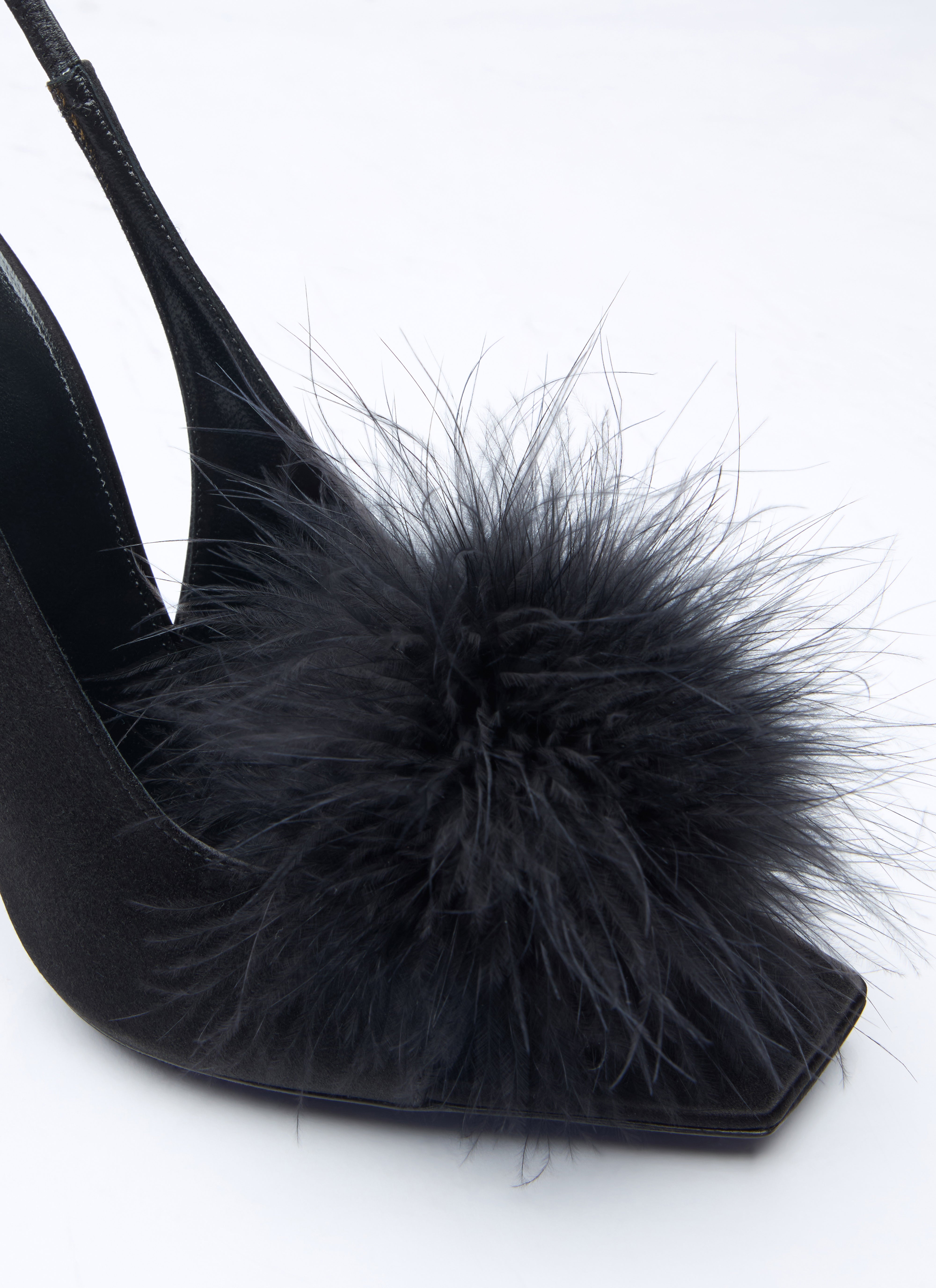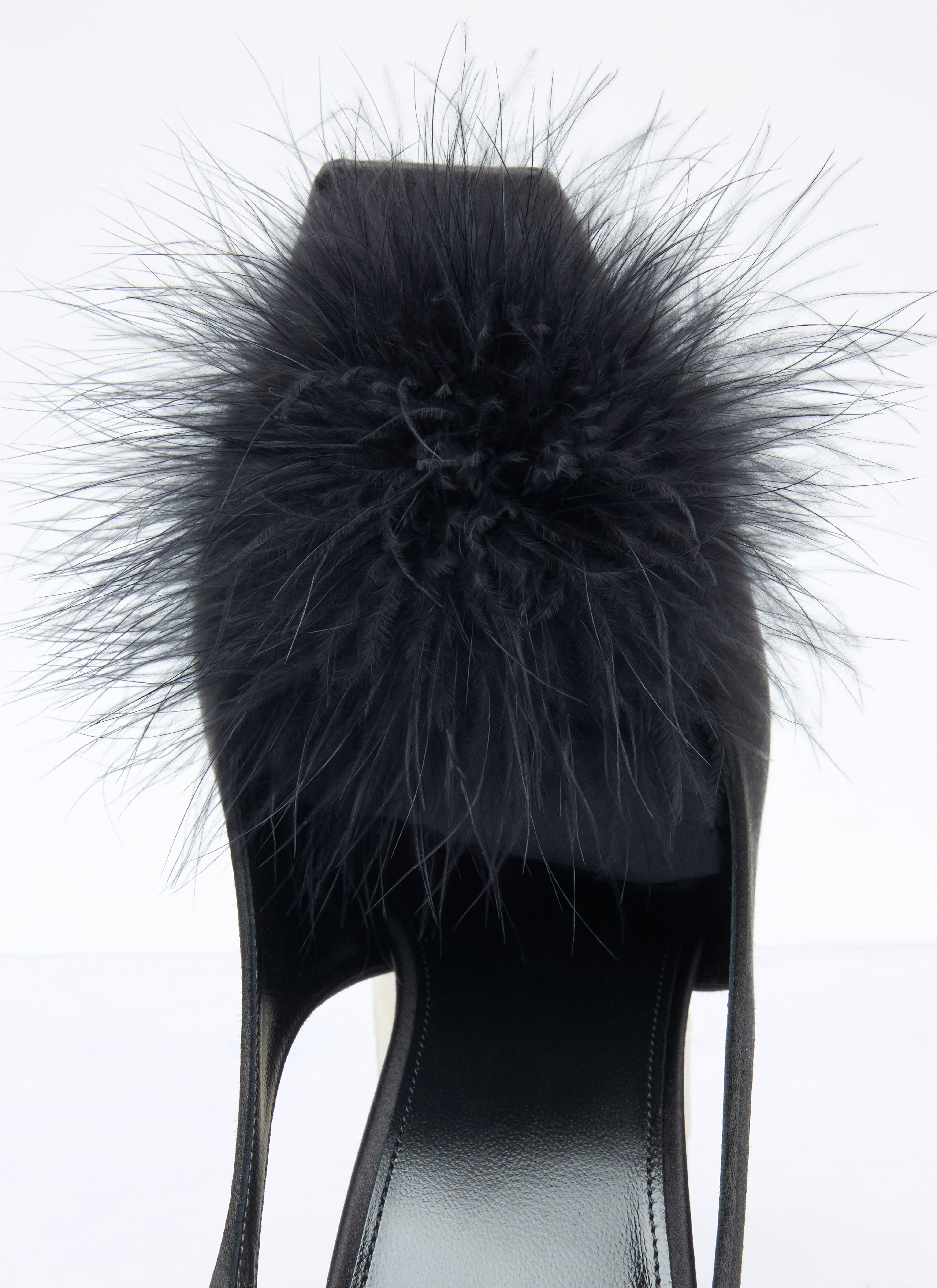 Harlow sandals in satin crepe with feather embellishment.