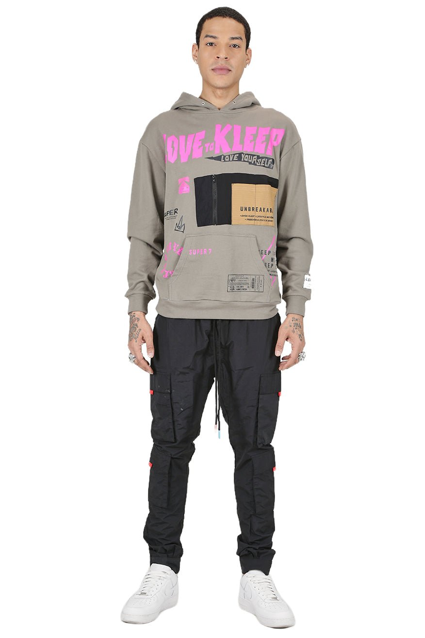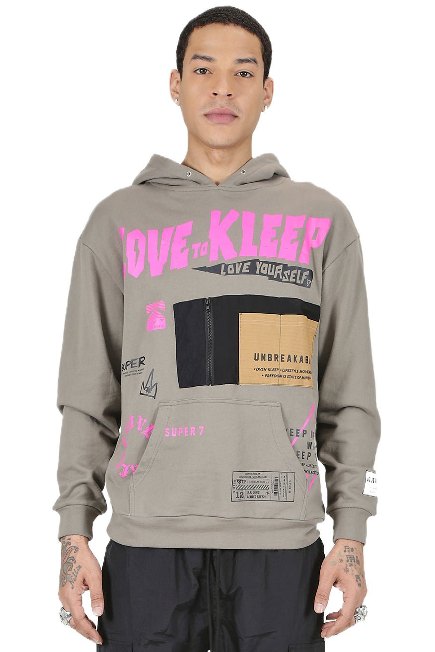 - 320g finely brushed French terry fleece with heavy screen prints, functional twill pocket & kangol pocket in front.