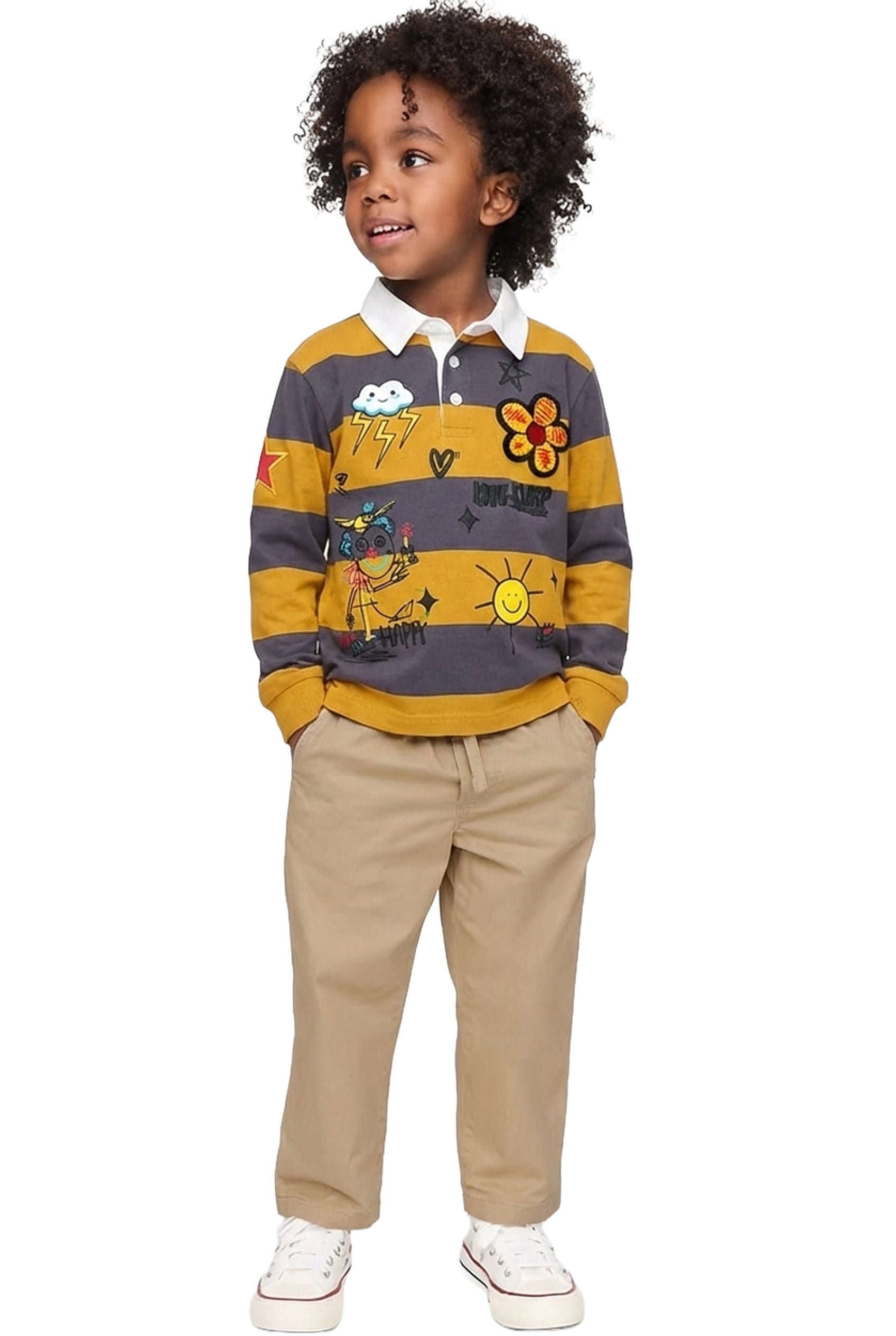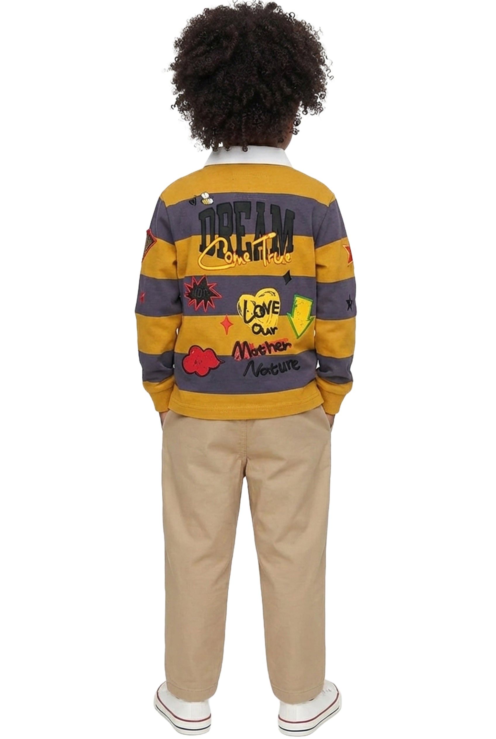 Kid's long sleeve polo shirt with heavy print effects & patch works.