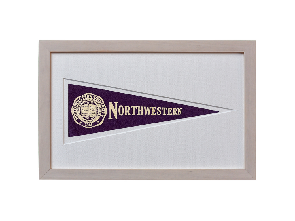 A rare piece of vintage Northwestern history from the 1950s available in your choice of a Light Wood or Mahogany frame. Framed in U/V glass and cut mat with the history of Hormel Pennants on the back.