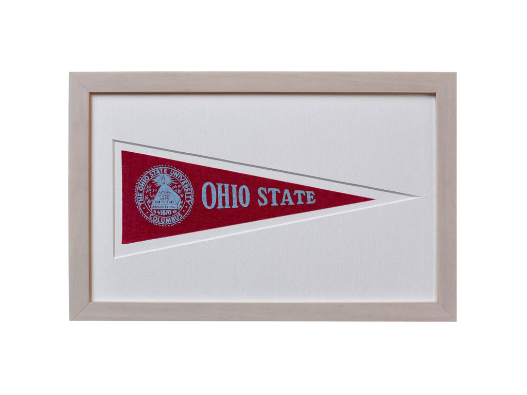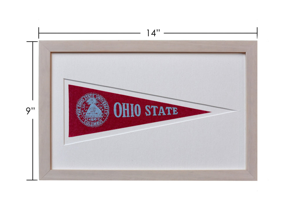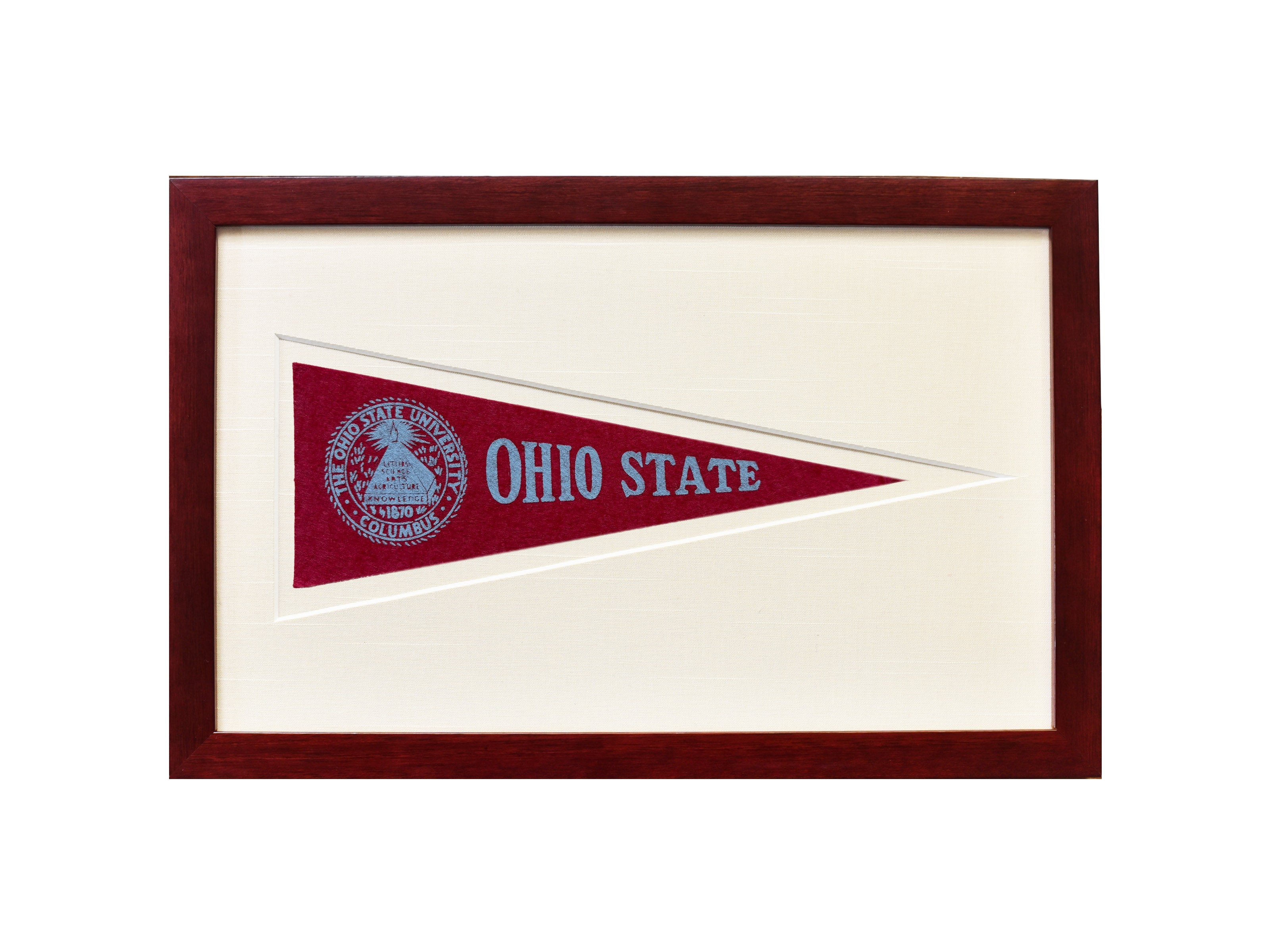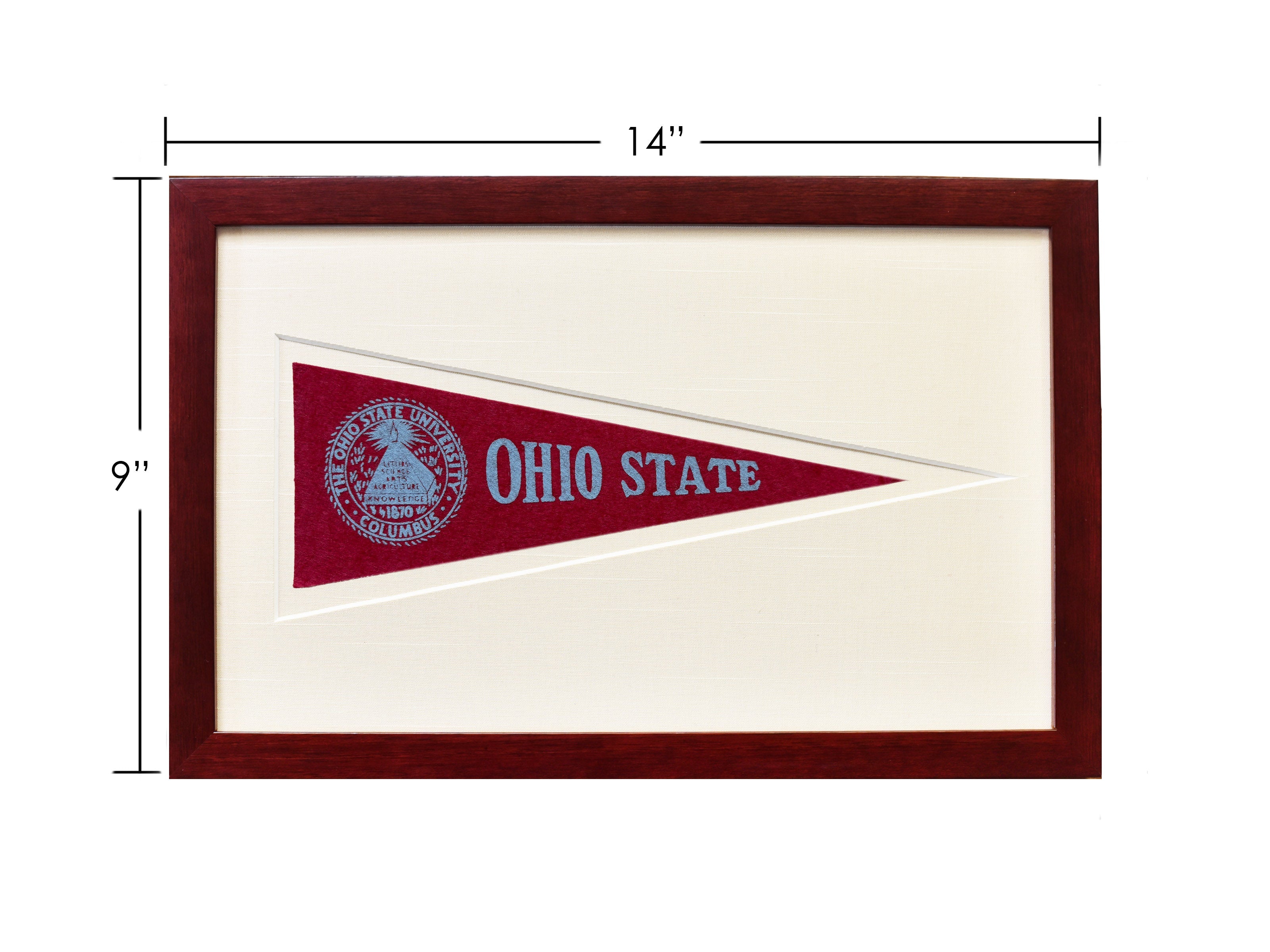 Calling all Buckeyes! A rare piece of vintage Ohio history from the 1950s available in your choice of a Light Wood or Mahogany frame. Framed in U/V glass and cut mat with the history of Hormel Pennants on the back.