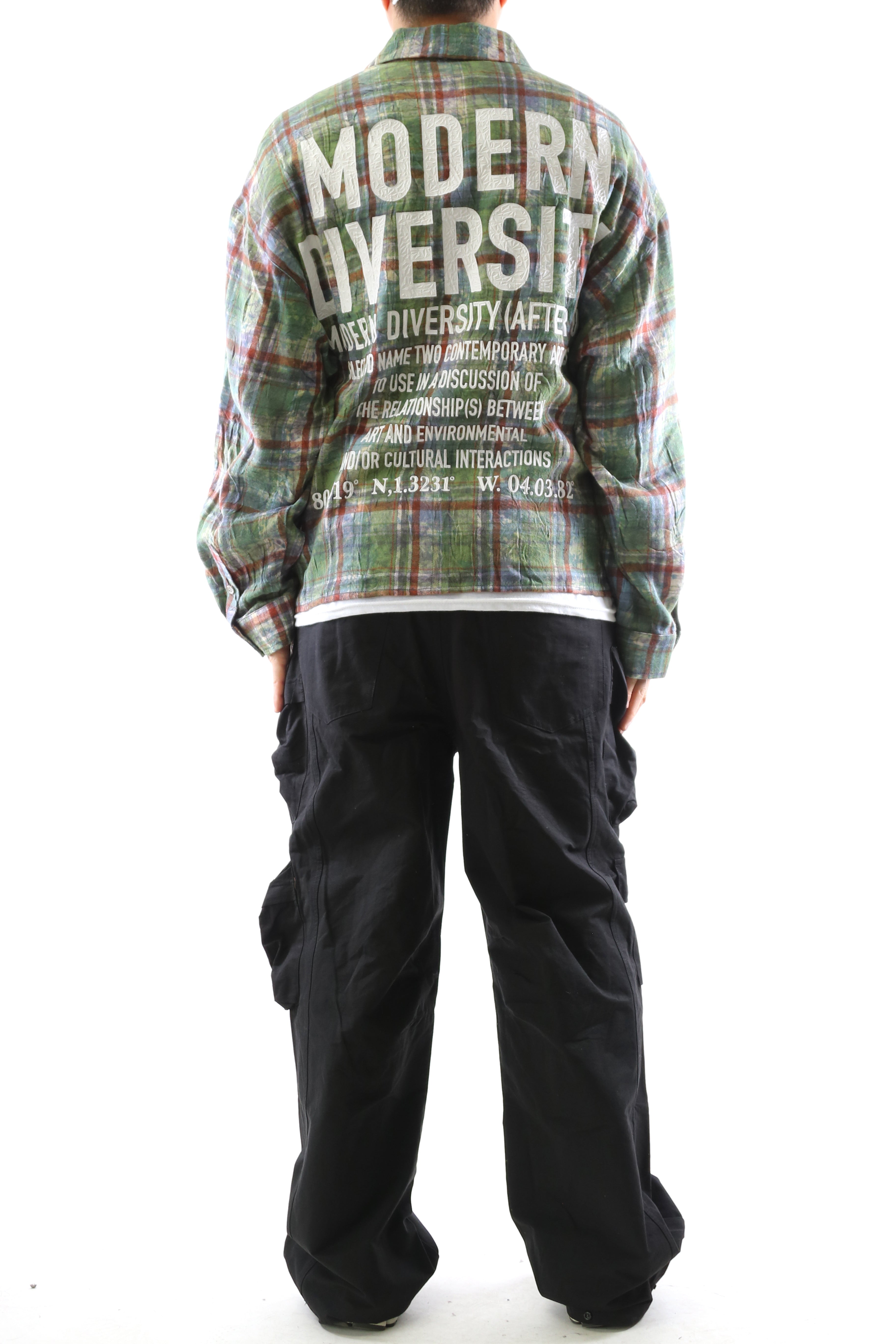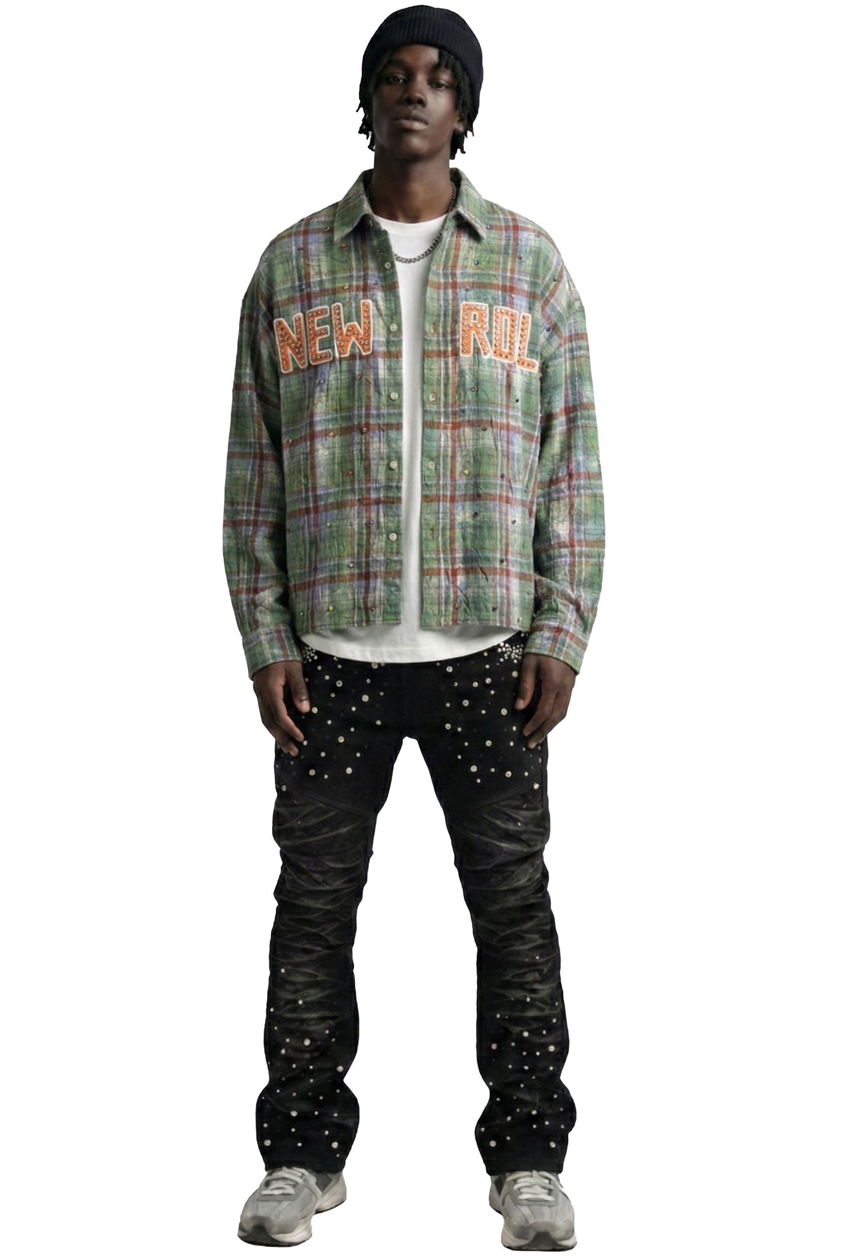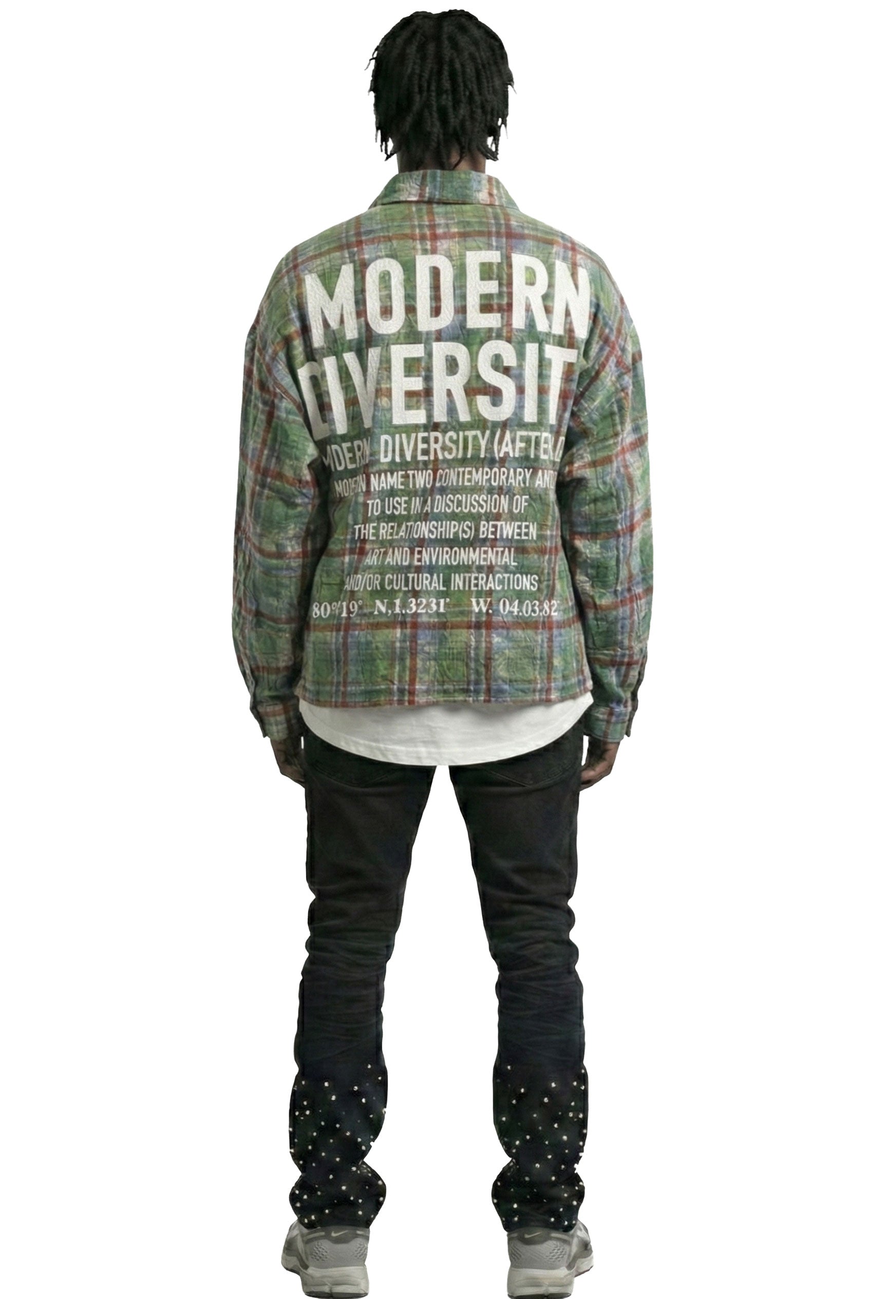 Step into a New Role with bold expression and refined street flair. This plaid button-up shirt features an Long sleeve boxy fit crop top style with intricate clear rhinestone embellishments scattered across the front and back. The front boldly declares NEW ROLE print with clear rhinestone, while the back features a powerful message: MODERN DIVERSITY—a call to embrace cultural and artistic dialogue. Crafted with premium cotton blend fabric for structure and comfort, this piece balances classic flannel appeal with progressive streetwear design.