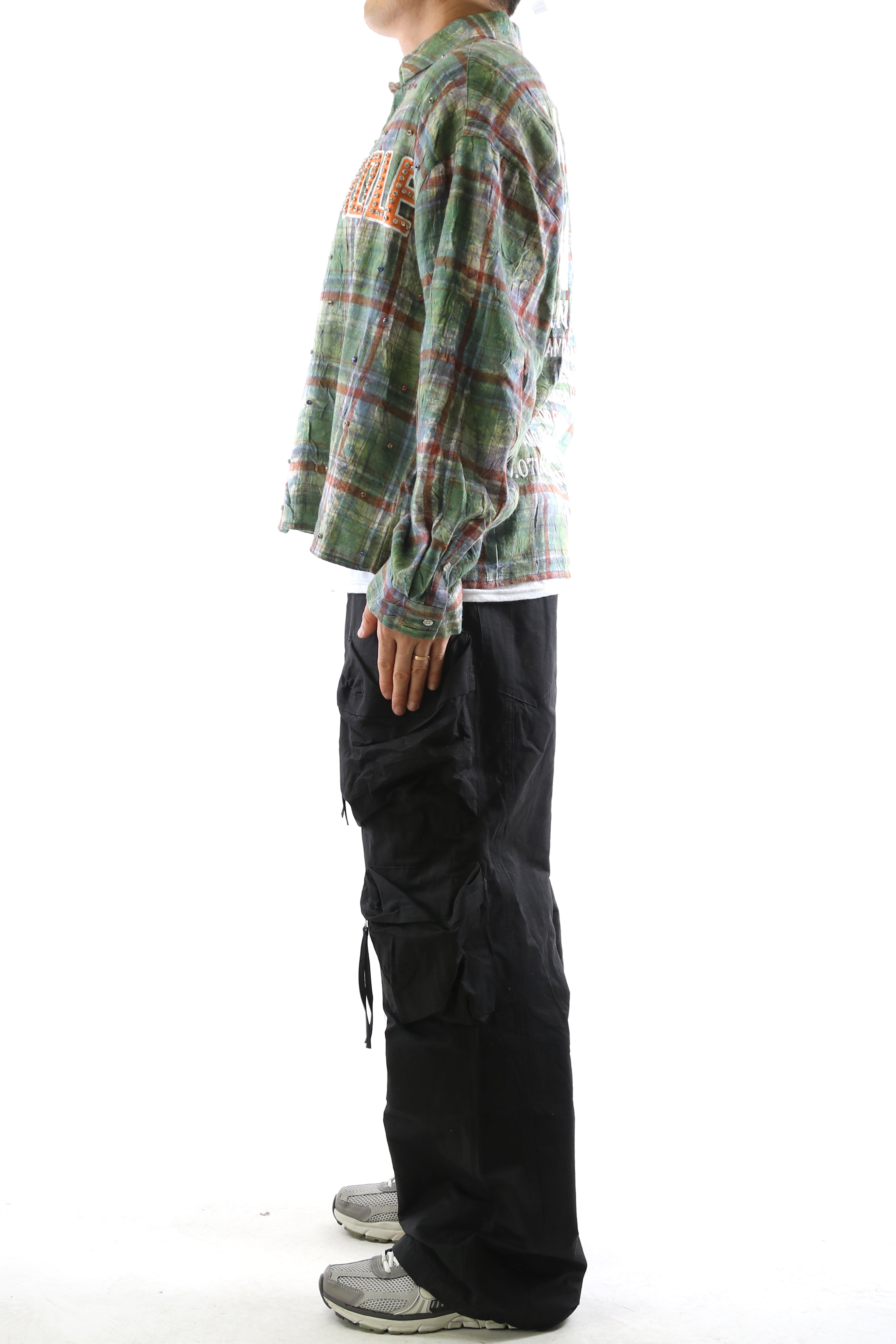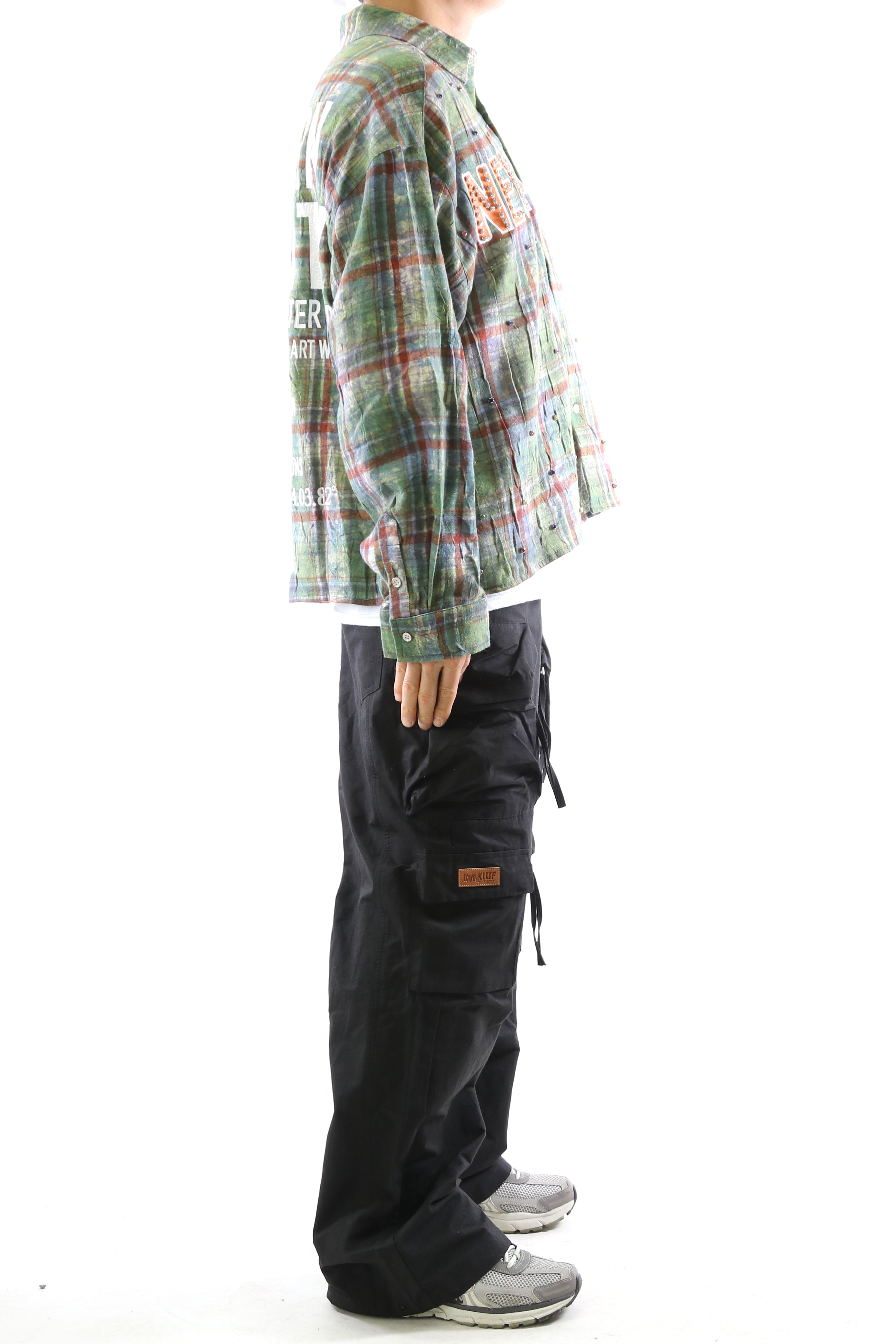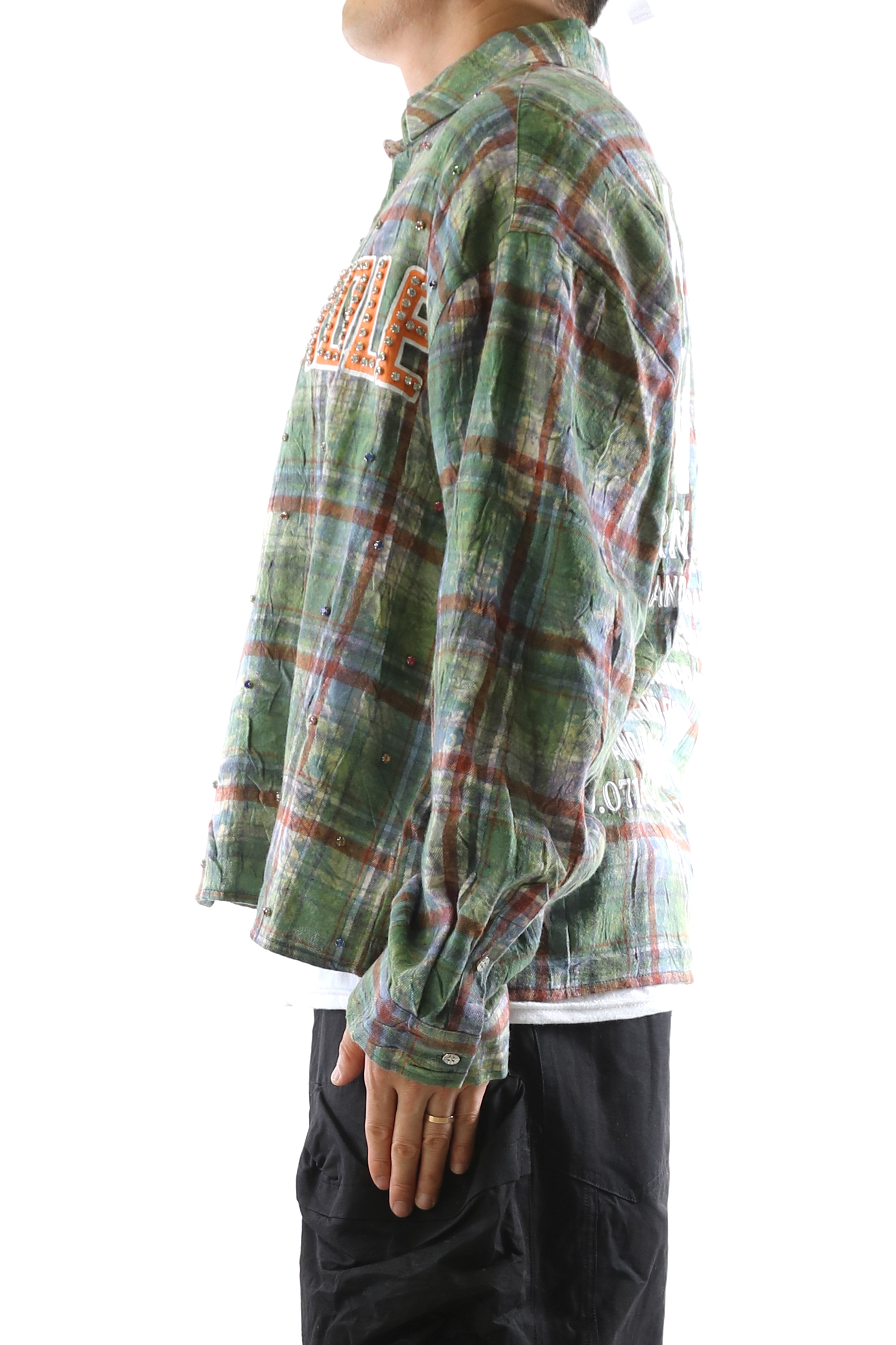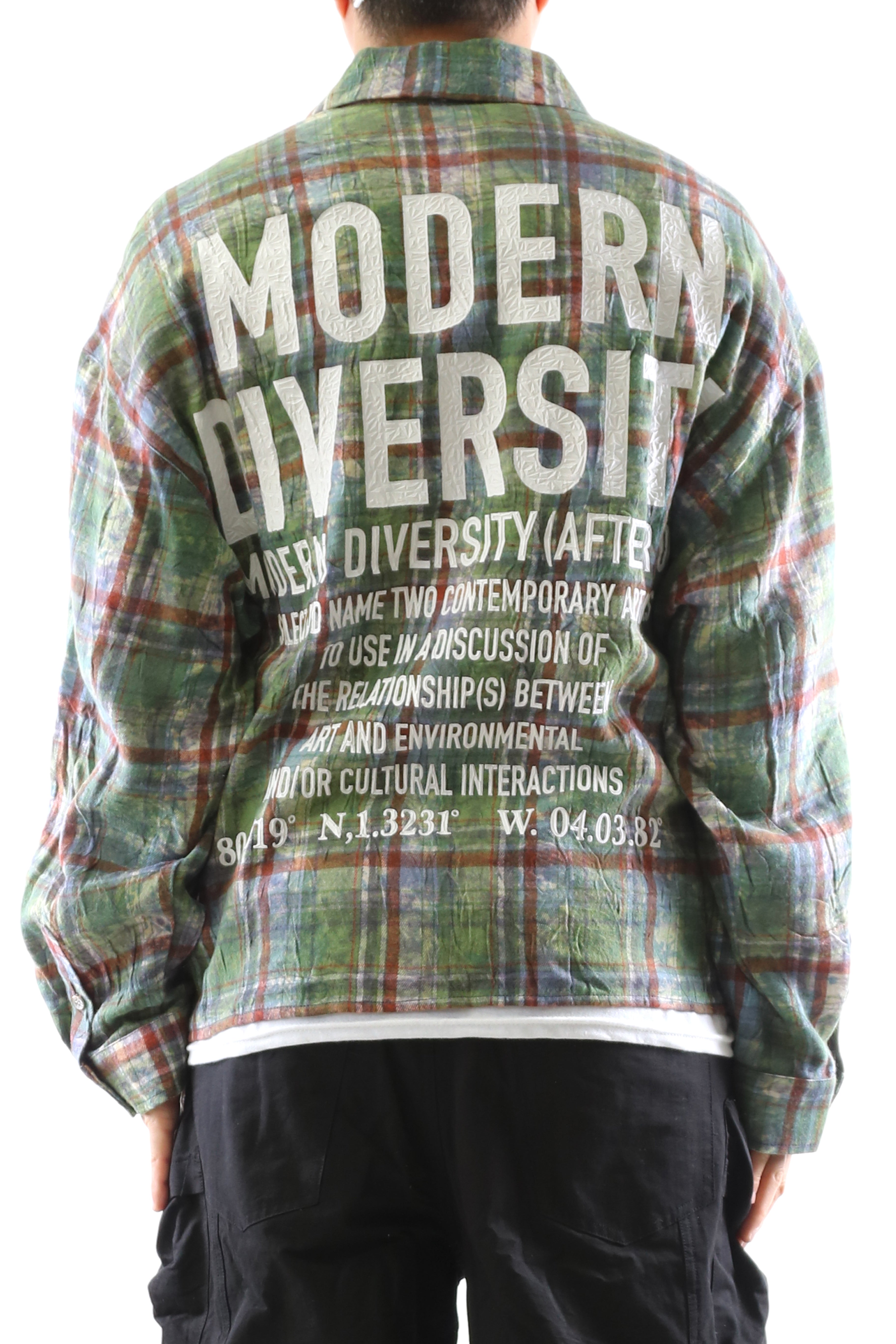 Step into a New Role with bold expression and refined street flair. This plaid button-up shirt features an Long sleeve boxy fit crop top style with intricate clear rhinestone embellishments scattered across the front and back. The front boldly declares NEW ROLE print with clear rhinestone, while the back features a powerful message: MODERN DIVERSITY—a call to embrace cultural and artistic dialogue. Crafted with premium cotton blend fabric for structure and comfort, this piece balances classic flannel appeal with progressive streetwear design.